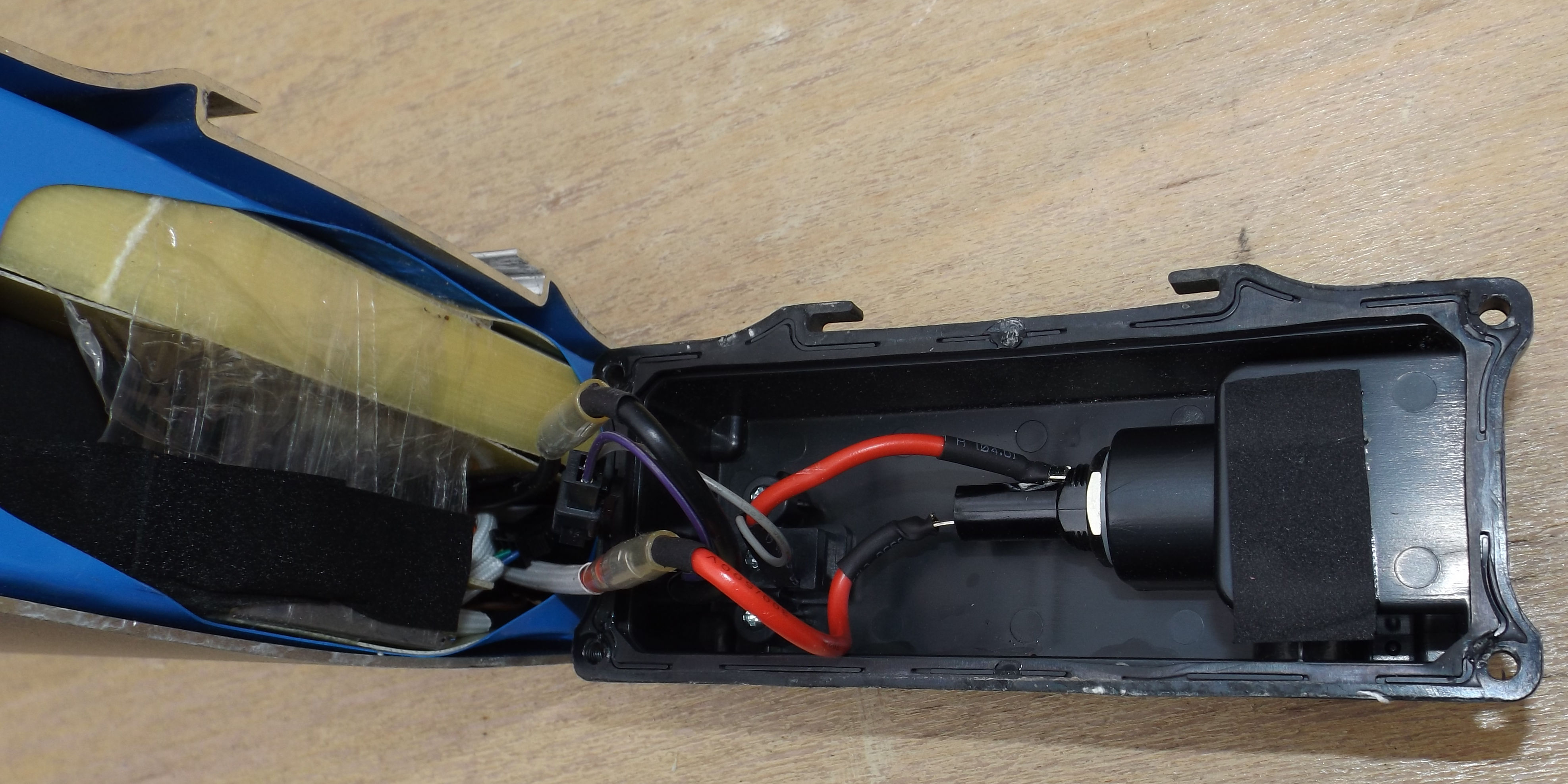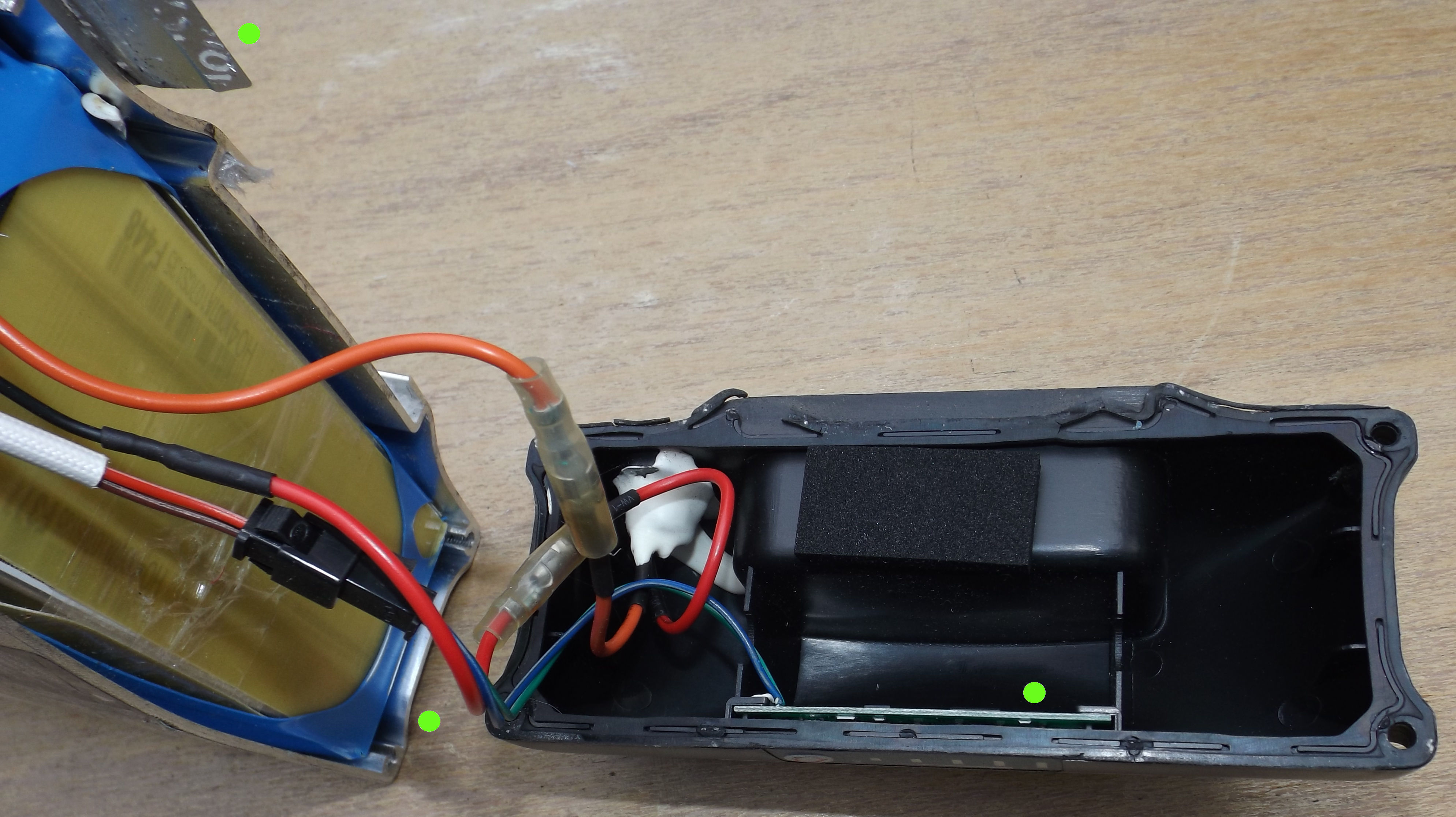 Von hier aus muß gepreßt werden. Das BMS hängt an den Kabeln, deren Steckverbindungen sich bis auf eine öffnen lassen. Das letzte Kabel hat am Ende (natürlich) einen Stecker, und wegen dem kann kann es nicht herausgezogen werden. Also am anderen Ende den Stecker abschneiden und dann das BMS herausnehmen.
