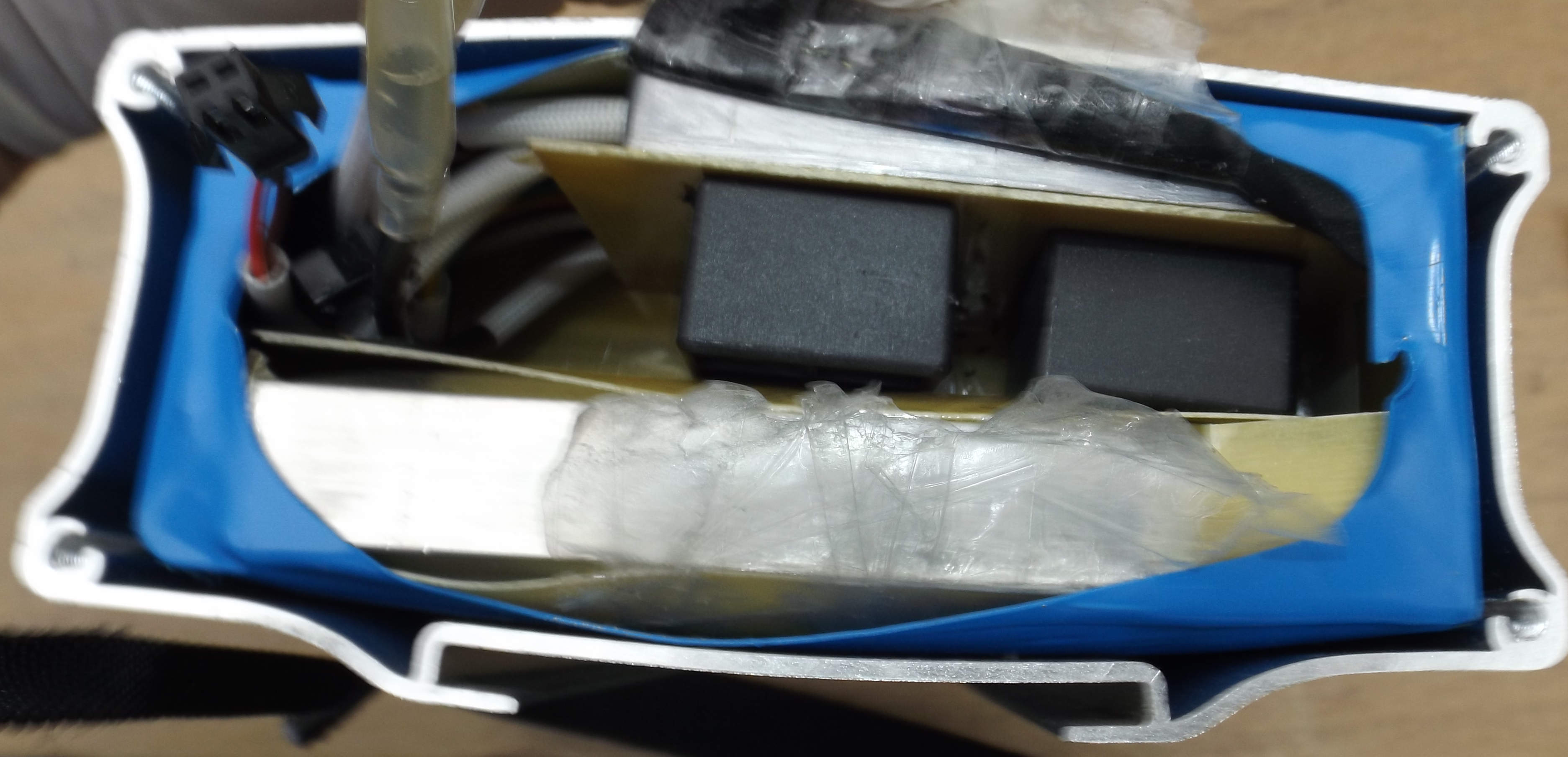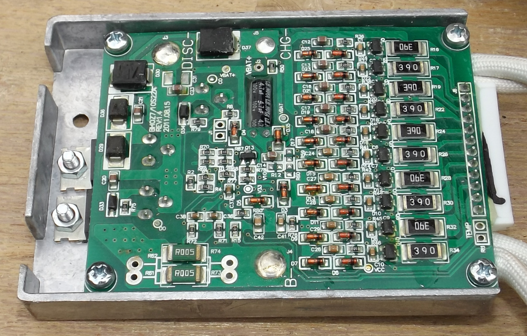 Links sieht man etwas schwarzes. Dahinter ist das BMS. Der hellbraune Streifen ist eine Art Pertinax, das ist das Material, aus dem Leiterplatten sind. Es dient als mechanischer Schutz und als Isolierung.