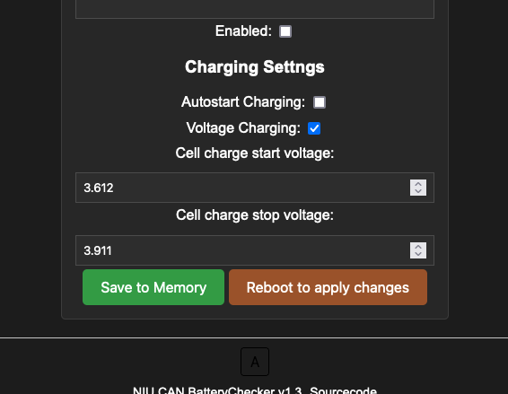 -> Wenn Ladung automatisch gestoppt wurde (weil Ziel Spannung erreicht wurde), kann man trotzdem manuell die Ladung (erneut) starten, es wird dann vollgeladen (Top-Up Funktion)