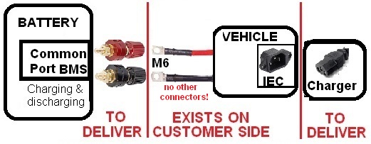 Sorry, hatte ich missverstanden. Wenn der Akku bereits ein (normales) Common Port BMS hat und die zusätzliche Ladesteckdose (IEC) ist direkt mit den Schaubpolen verbunden (außerhalb des BMS), ist das natürlich der Akku, so wie Du ihn brauchst und die (innerhalb des Fahrzeuges verborgen) mit beiden eingekreisten Polschuhen verbundenen Kabel können so bleiben.