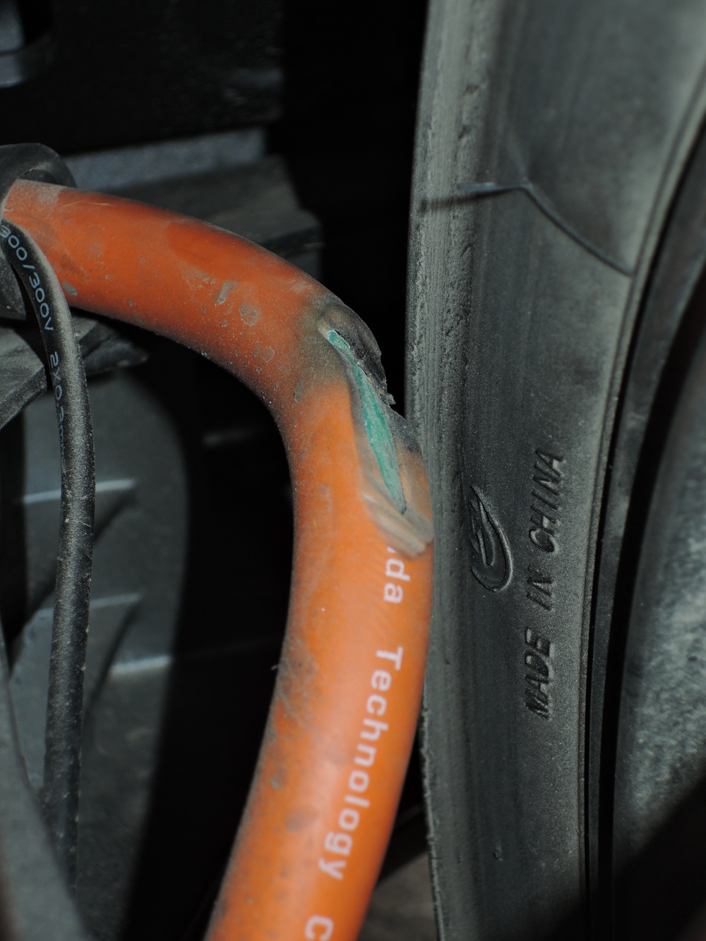An meinem erst wenige Tage in Betrieb befindlichen neuen Niu NQiX 300 ist ein problematischer Schaden aufgetreten: das dicke Elektrokabel der Stromzuführung für den Radnabenmotor geriet während der Fahrt an die Flanke des Hinterreifens und die Kabel-Ummantelung wurde weg radiert: die internen Kabel liegen zumindest teilweise offen. Bemerkt wurde der Schaden bei einer Stop-and-go-Fahrt in einer Fahrzeugschlange vor einer roten Ampel. Da vernahm ich ein mir unbekanntes Quietsch-Geräusch. Die Quelle des Geräusches konnte ich (Helm auf) nicht gleich verorten, auch, weil ich anfangs an sowas wie Bremsenquietschen bei einem der mich umgebenden Autos dachte. Als sich die hinter der Ampel in alle Richtungen entfernten, blieb nur der eigene Roller übrig. Is klar, gleich auf den Bürgersteig, aber da war es bereits passiert.