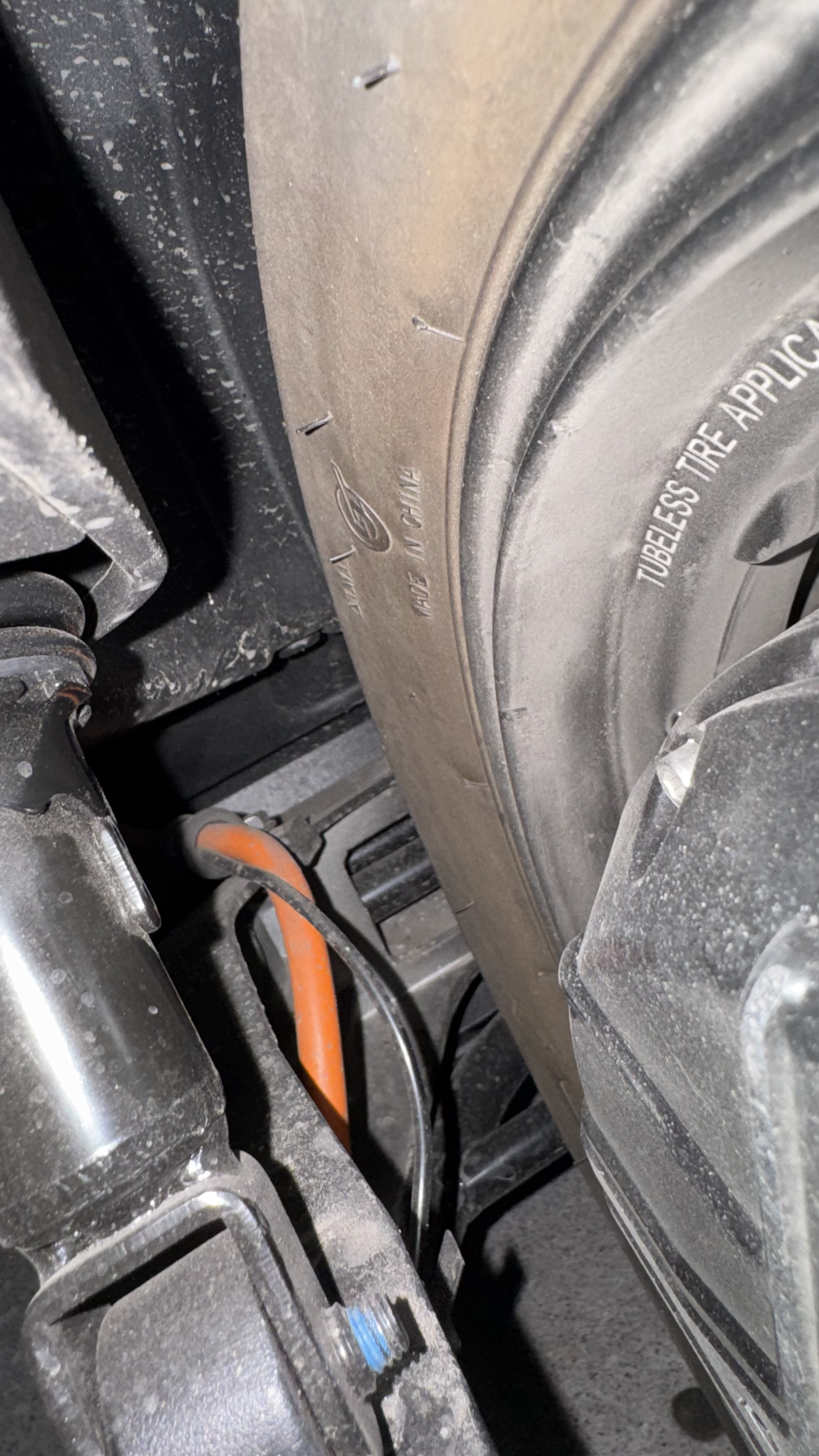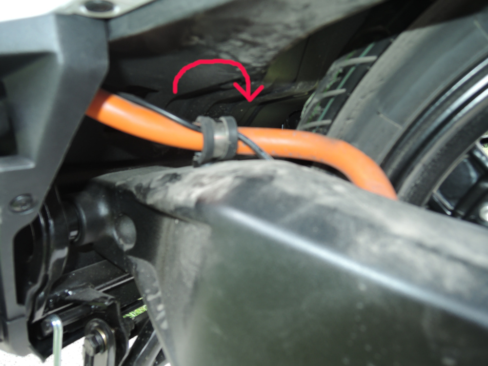 Dieses dicke, orangene Kabel wird von vorne nach hinten zum Motor über die Hinterrad-Schwinge links vom Rad geführt. Fixiert ist es an zwei Stellen: