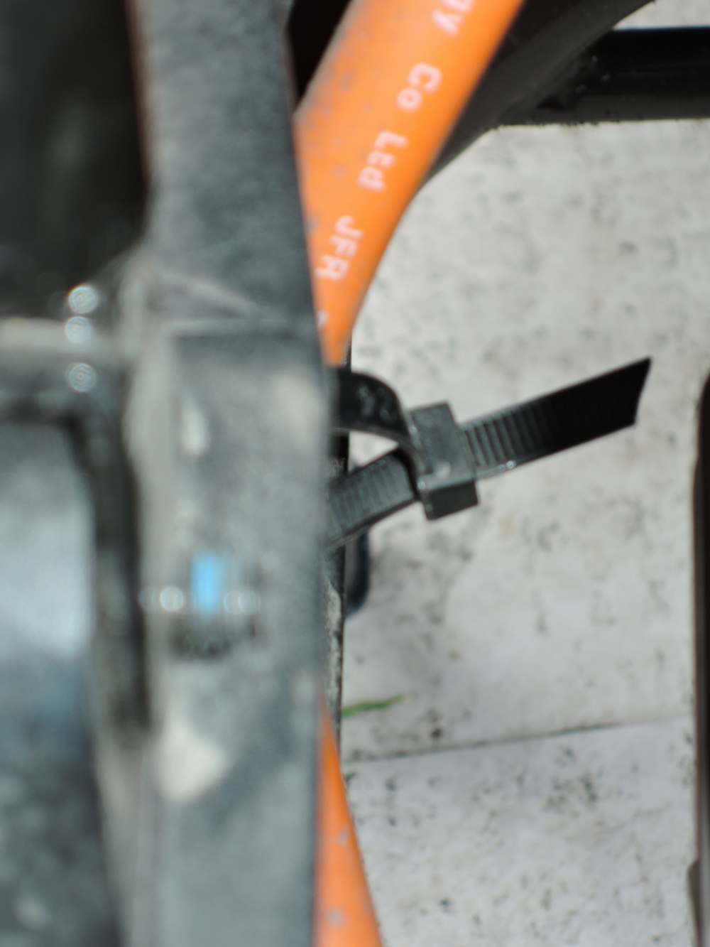 Dieses dicke, orangene Kabel wird von vorne nach hinten zum Motor über die Hinterrad-Schwinge links vom Rad geführt. Fixiert ist es an zwei Stellen: