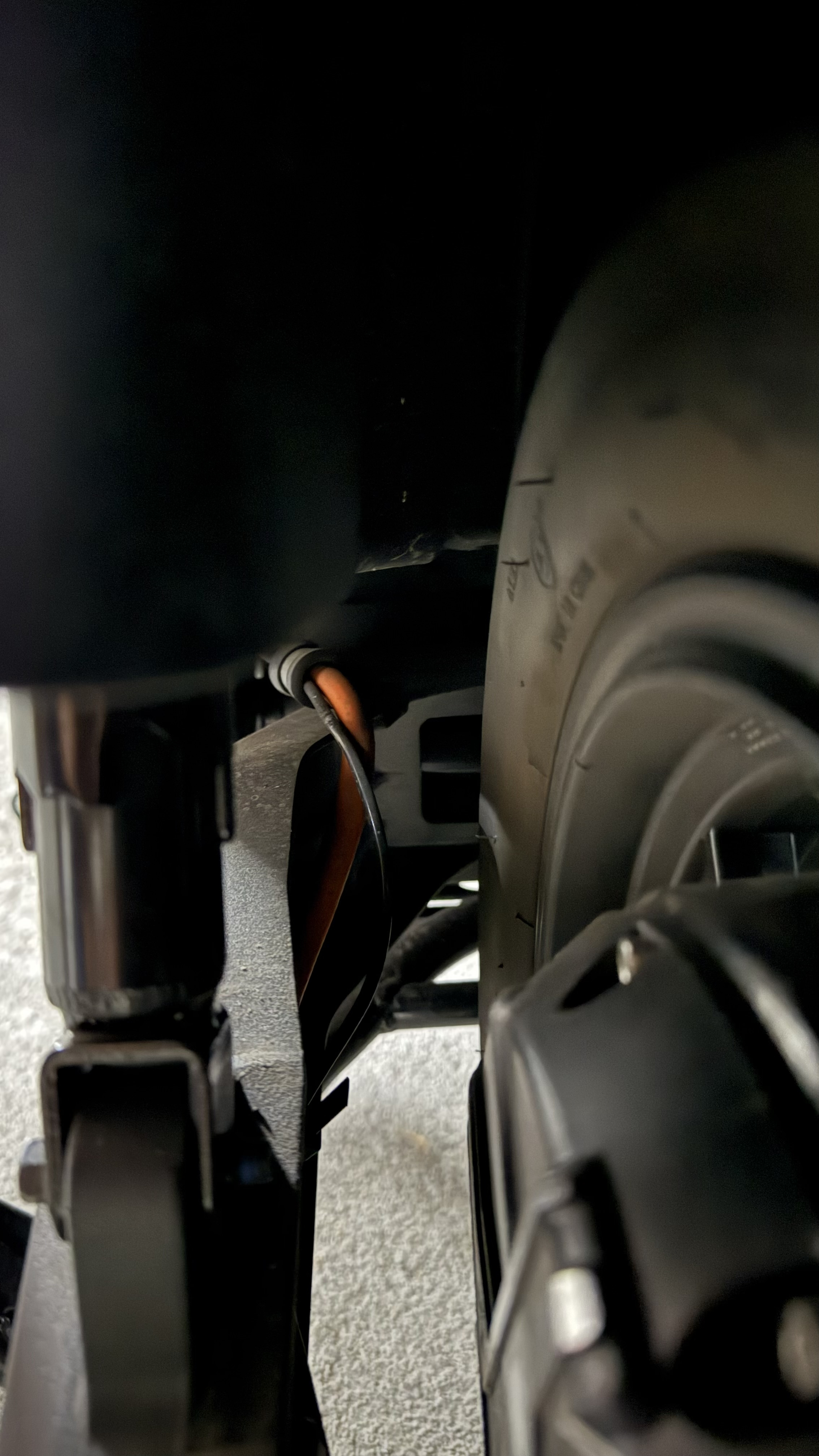 - diese Schlinge wird oberhalb des Gummipuffers zu sehr in Richtung Rad geführt. Das hätte enger zu der Schwinge hin geführt sein müssen.