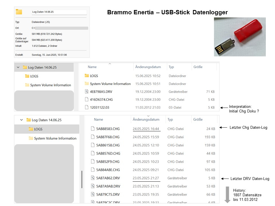 Heute, Sonntag habe ich den Data Log USB-Stick auf den PC kopiert und versucht die Dateien zu interpretieren. Anbei ein paar Screenshots. Die einzige lesbare Datei, wurde wohl bei Produktion 2012 abgelegt und dokumentiert die initialen Daten? Vermutlich kann man die aktuellen "*.chg" und "*.drv" Dateien nur mit einer passenden Brammo Diagnosesoftware aus Deinen Links in lesbare Informationen konvertieren. Mal sehen. Vielen Dank, Ralph