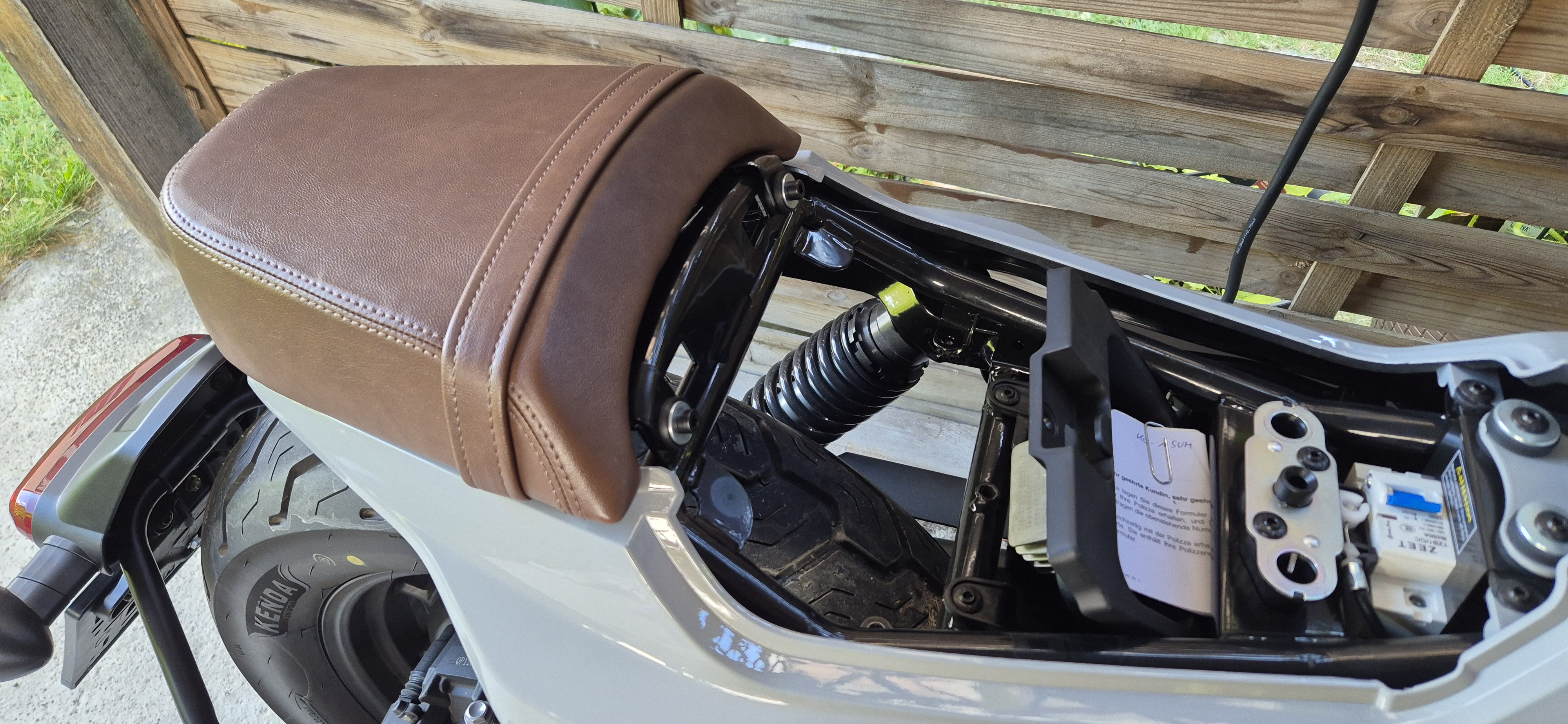 Schnabelwesen hat geschrieben: So 29. Jun 2025, 23:44 Das sieht ja schon mal gut aus. Das Schutz"blech" muss tatsächlich unbedingt hinten festgeschraubt werden, sonst vibriert das bestimmt kaputt. Du könntest eine flache Schraube mit Linsenkopf oder so nehmen und sie von oben durchstecken. Dann musst du zwar Scheibe und Mutter von unten dranfummeln. Aber oben unter dem Sitz trägt es weniger auf.