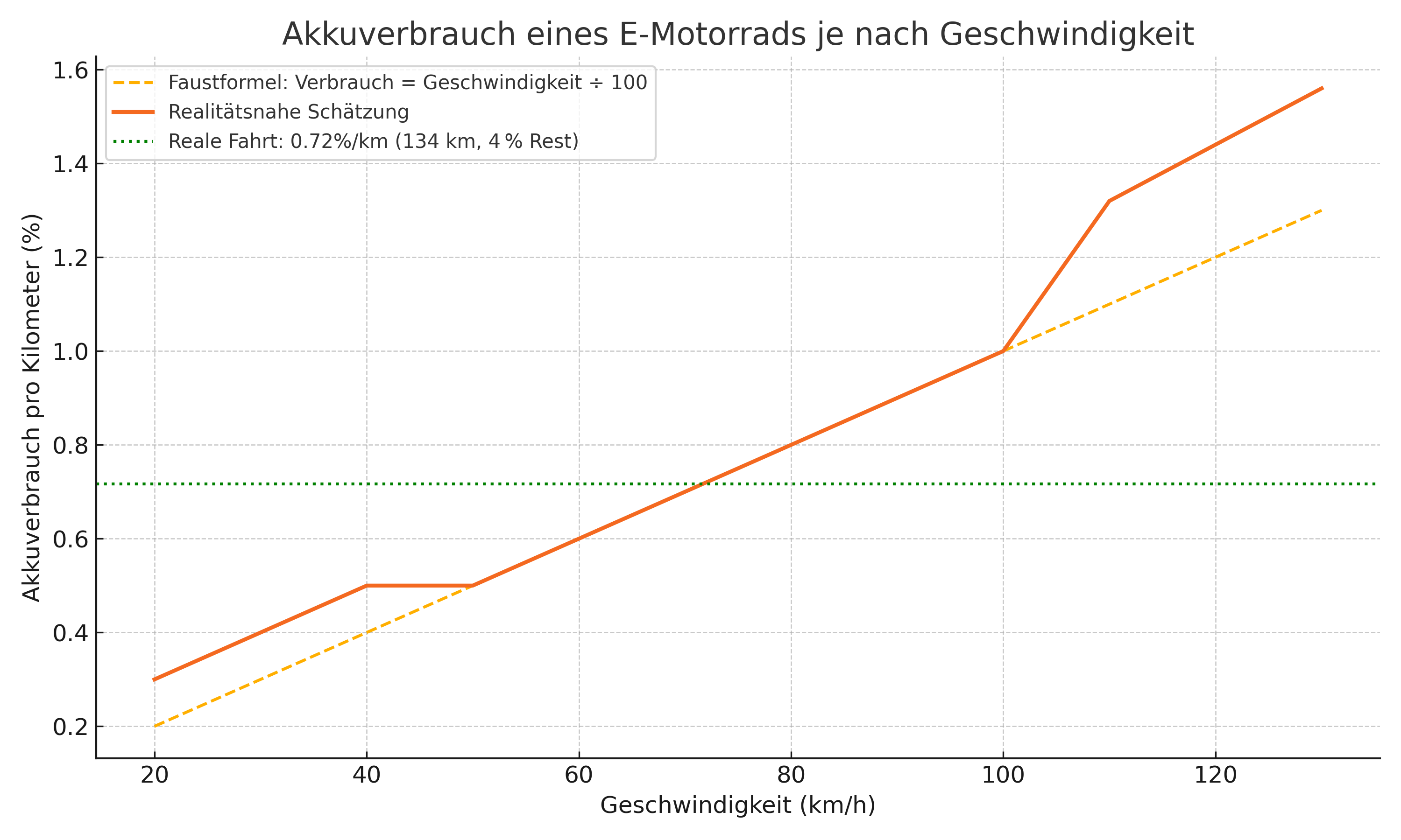 Man kann grob sagen von 60 bis 100 verbraucht man 1% Akku pro Kilometer.