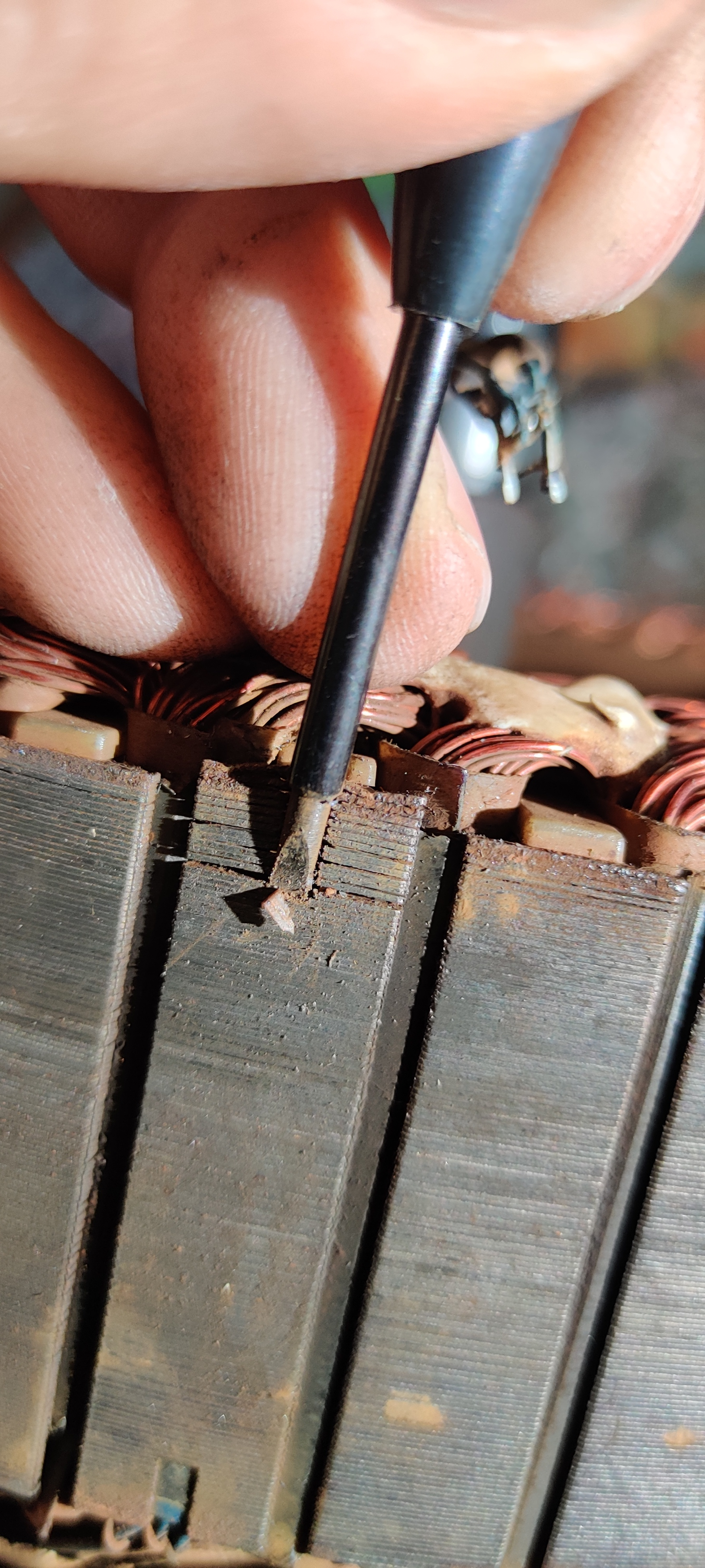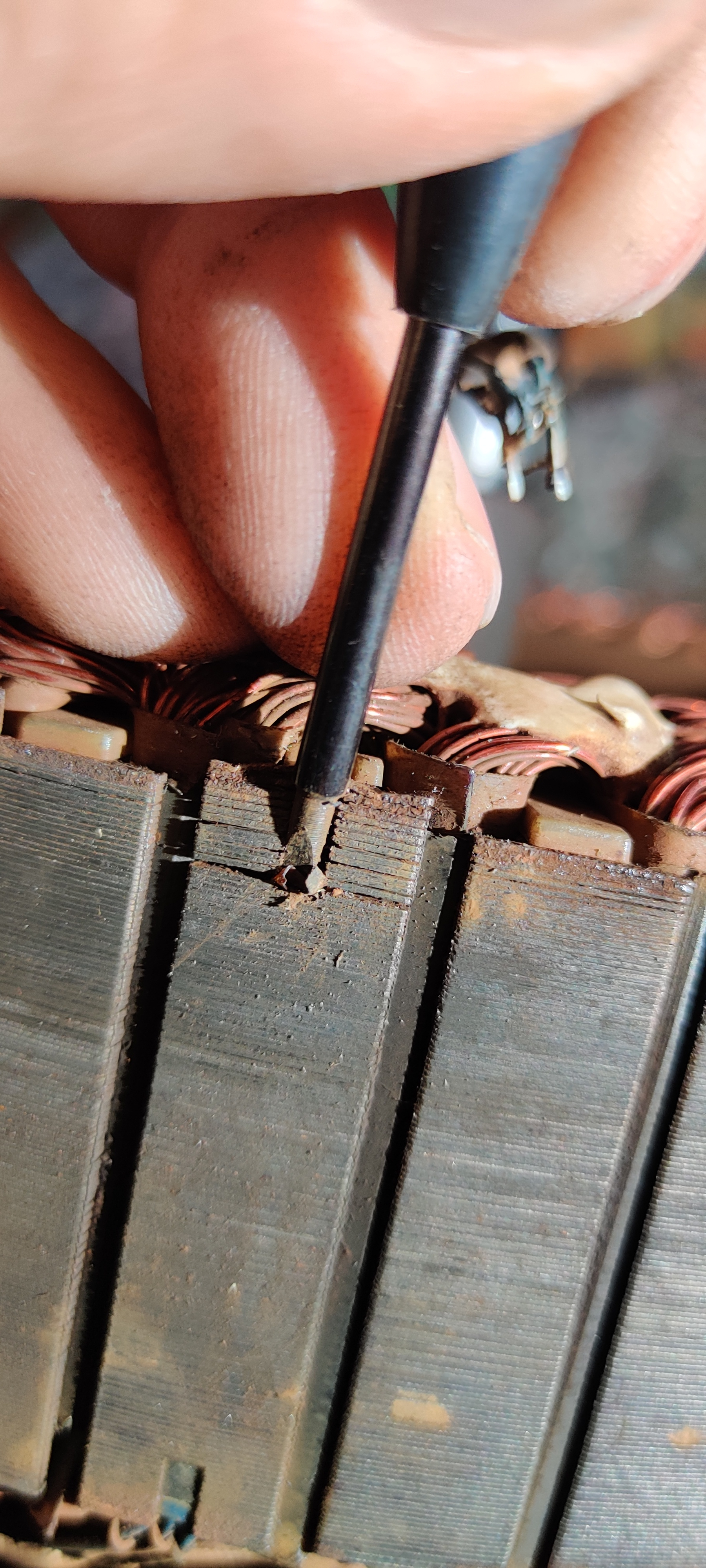 Man erkennt hier ganz gut, wie der Motor aufgebaut sind. Das Metall liegt in vielen dünnen Schichten aufeinander. Wenn man die Hall-Sensoren rausbekommen möchte, muss man ganz unten einen Schraubendreher (möglichst klein, Stromprüfer war bei mir zu groß) ansetzen und mit dem Hammer reintreiben. (Dezente Schläge)...