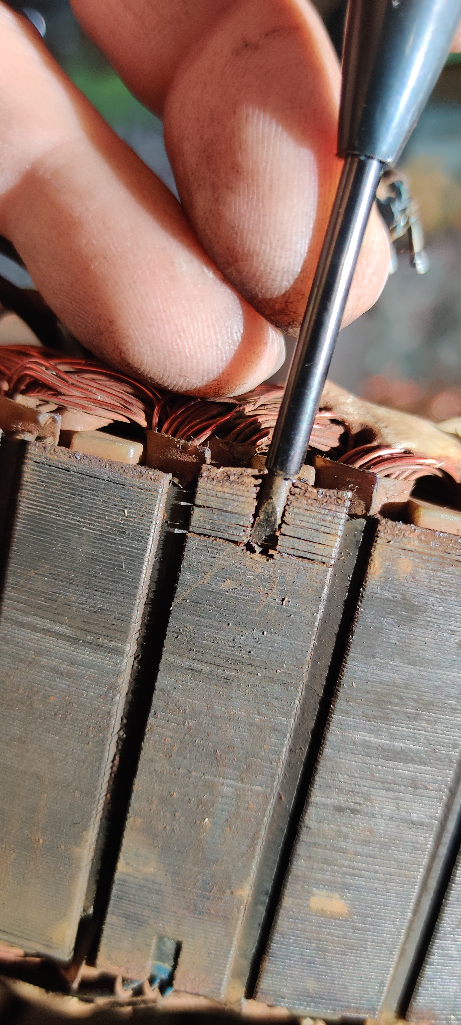 Man erkennt hier ganz gut, wie der Motor aufgebaut sind. Das Metall liegt in vielen dünnen Schichten aufeinander. Wenn man die Hall-Sensoren rausbekommen möchte, muss man ganz unten einen Schraubendreher (möglichst klein, Stromprüfer war bei mir zu groß) ansetzen und mit dem Hammer reintreiben. (Dezente Schläge)