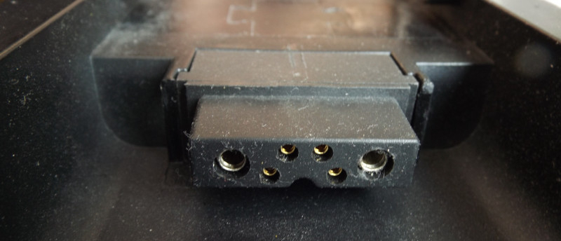 So sieht der Stecker an der Unterseite des Akkus aus. Ich nehme nicht an, daß diese Konstruktion völlig isoliert entstanden ist für ein einziges Fahrrad. Dazu wäre die Stückzahl viel zu klein. Wo also wird dieses Ding ebenfalls verwendet? Das herauszufinden wäre ein großer Schritt vorwärts.