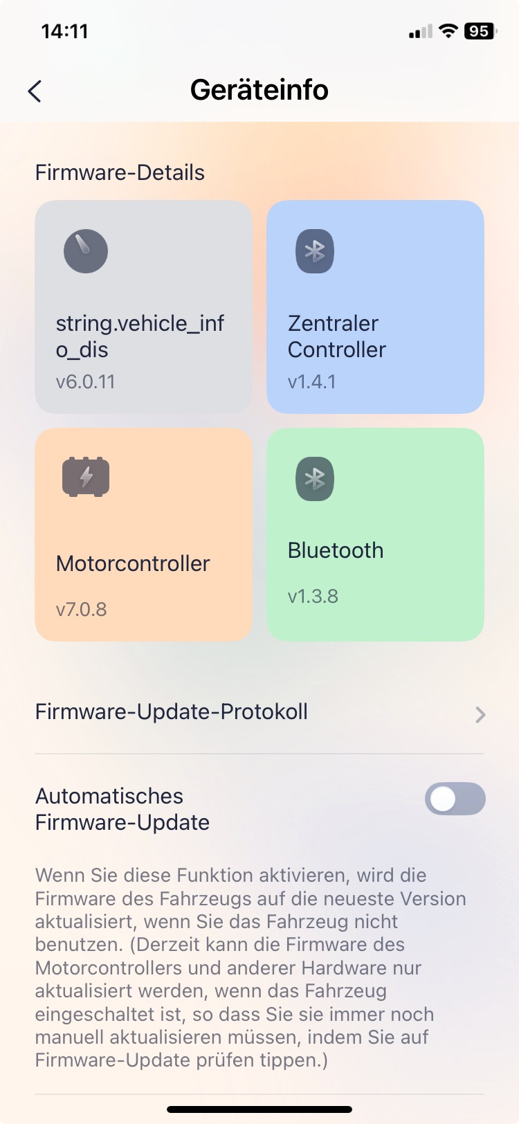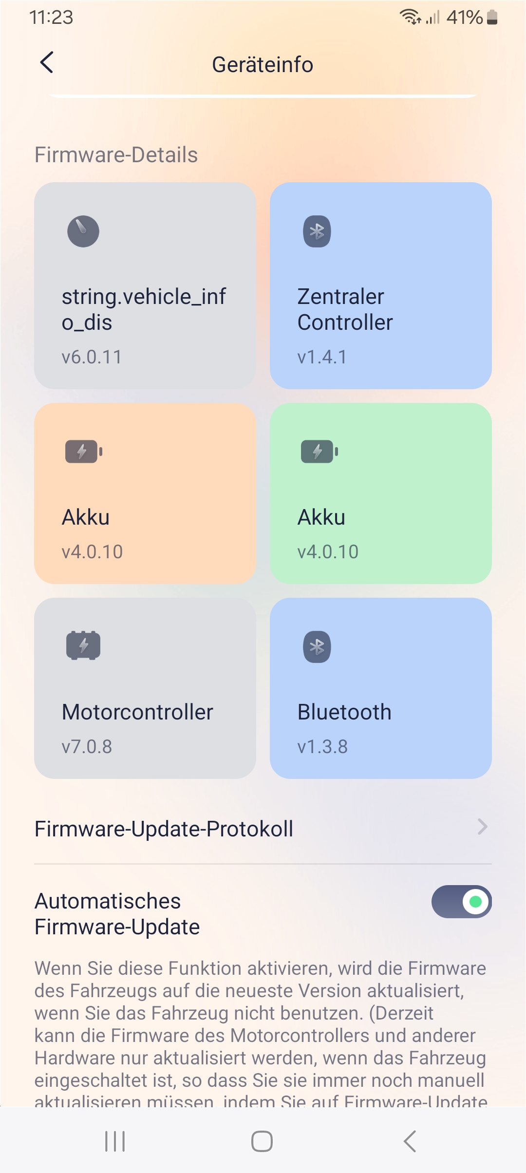 In der App auf Android steht nun unter Firmwaredetails statt Dashboard Controller string.vehicle_info_dis, vorher wie nachher mit der Version 6.0.11.