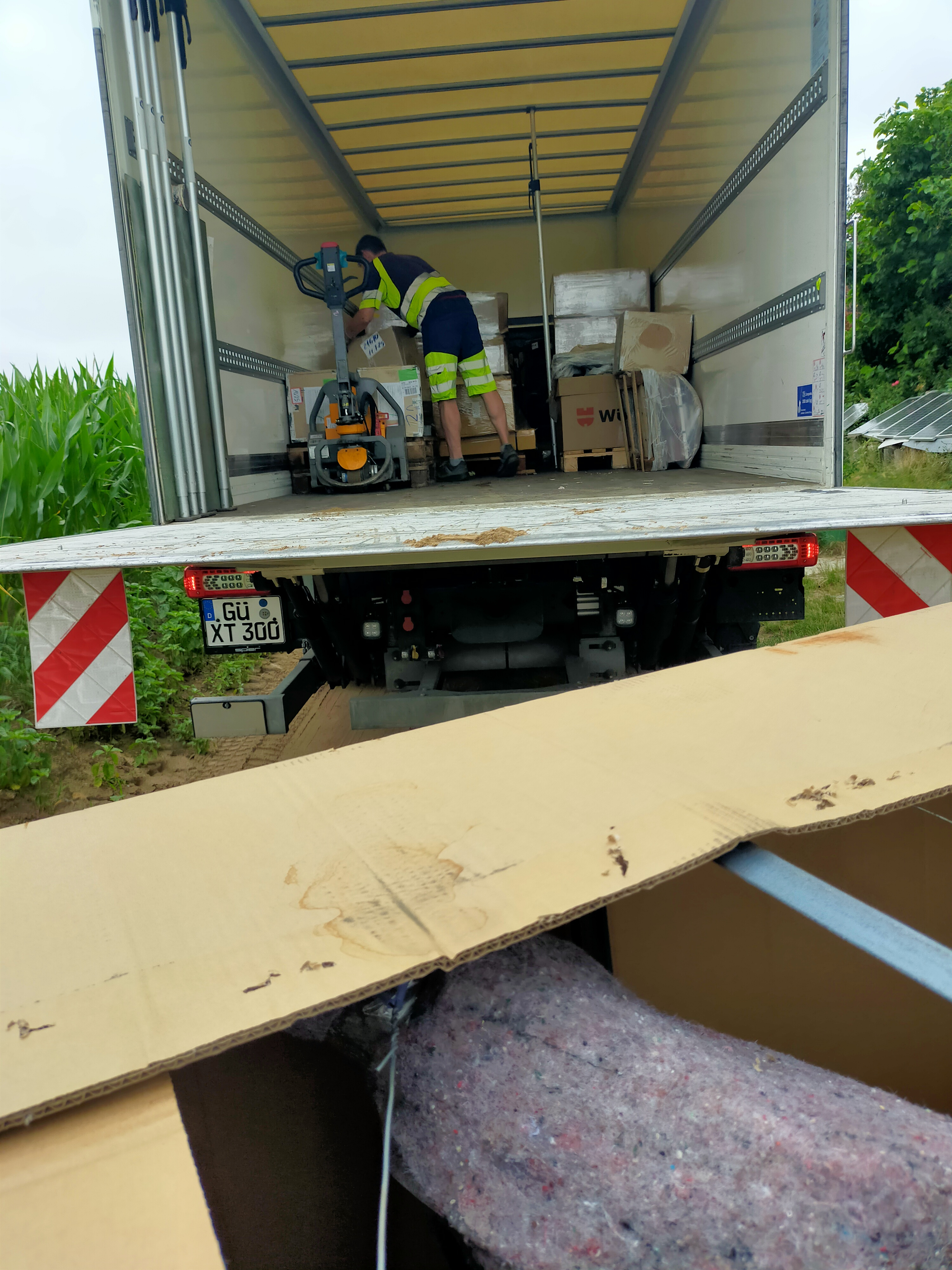 Auf einem Foto sieht man wie eine Gitterbox Strebe total verbogen ist. Ein Transportkäfig ist notwendig. Bei Anlieferung war die Pappe oben offen, vielleicht hat man dort von oben den 30 Ah Akku im kleinen extra Karton befindlich auf das Fußtrittbrett gelegt. Die verbogene Strebe reichte bis an den Akku heran.