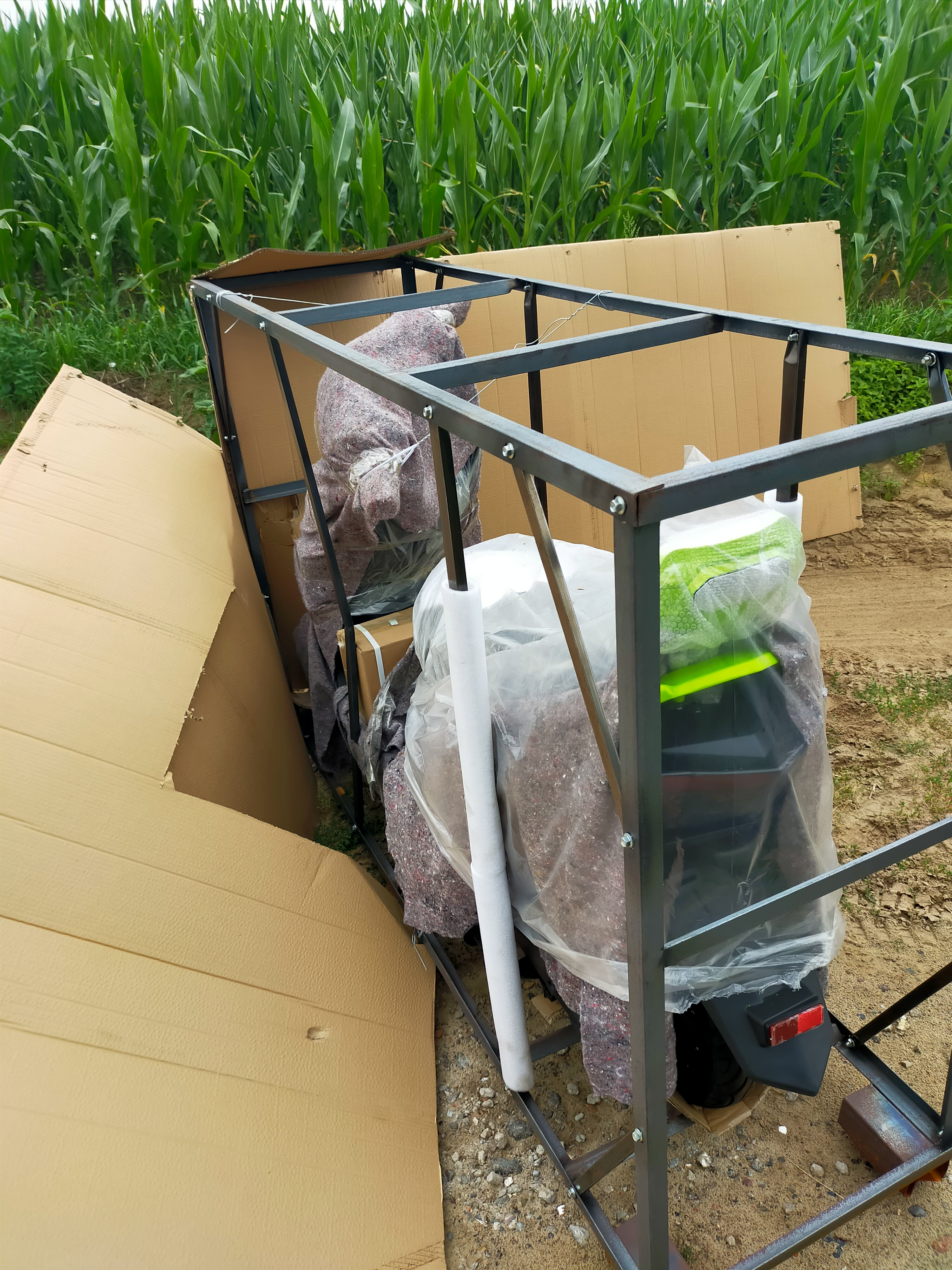 Auf einem Foto sieht man wie eine Gitterbox Strebe total verbogen ist. Ein Transportkäfig ist notwendig. Bei Anlieferung war die Pappe oben offen, vielleicht hat man dort von oben den 30 Ah Akku im kleinen extra Karton befindlich auf das Fußtrittbrett gelegt. Die verbogene Strebe reichte bis an den Akku heran.