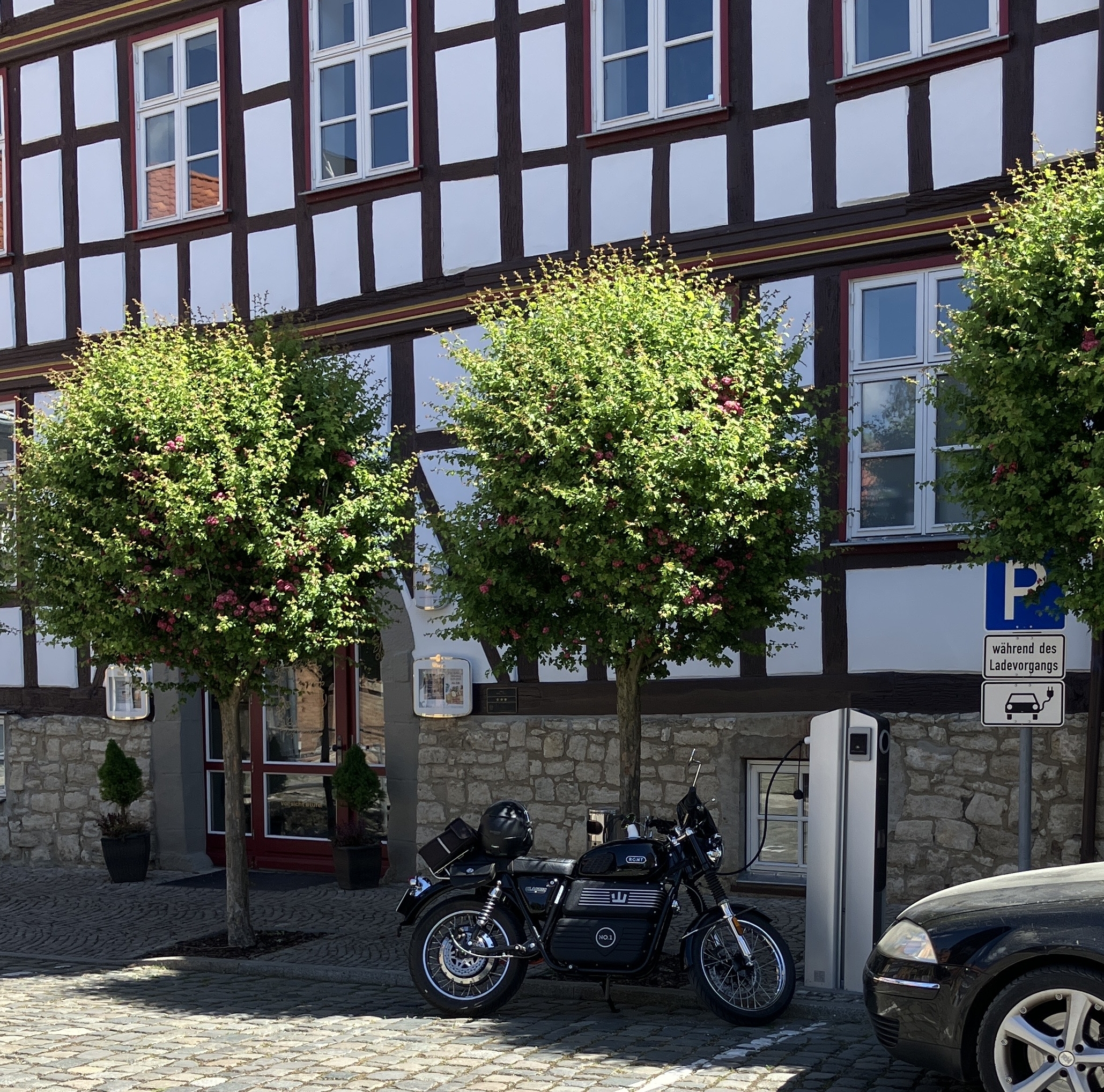 In der Fachwerkstadt Osterwieck wurde ein kurzer Sicherheitsstopp als "Frischzellenkur" für den Akku eingelegt. Danach ging es weiter nach Zilly zur Harzer Bike Schmiede, https://www.harzer-bike-schmiede.de/home.html auf einer alten Hofstelle werden kuriose Eigenbauten, z.B. eie URAL mit zwei Beiwagen, alte Maschinen und Handwerzeuge ausgestellt.