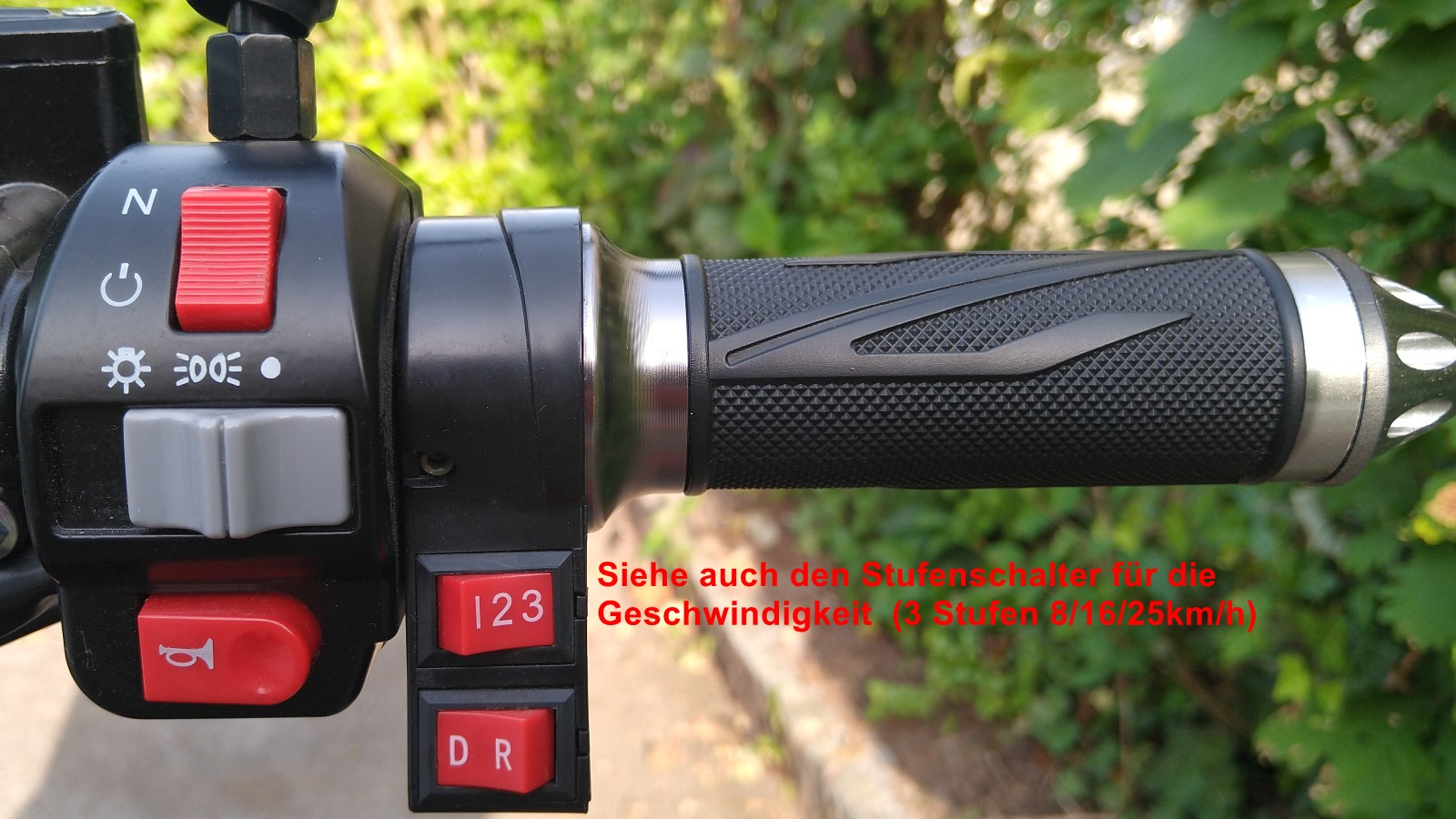 Es befindet auch am rechten "Gasgriff" ein Stufenschalter für die Geschwindigkeit (3 Stufen 8/16/25km/h)