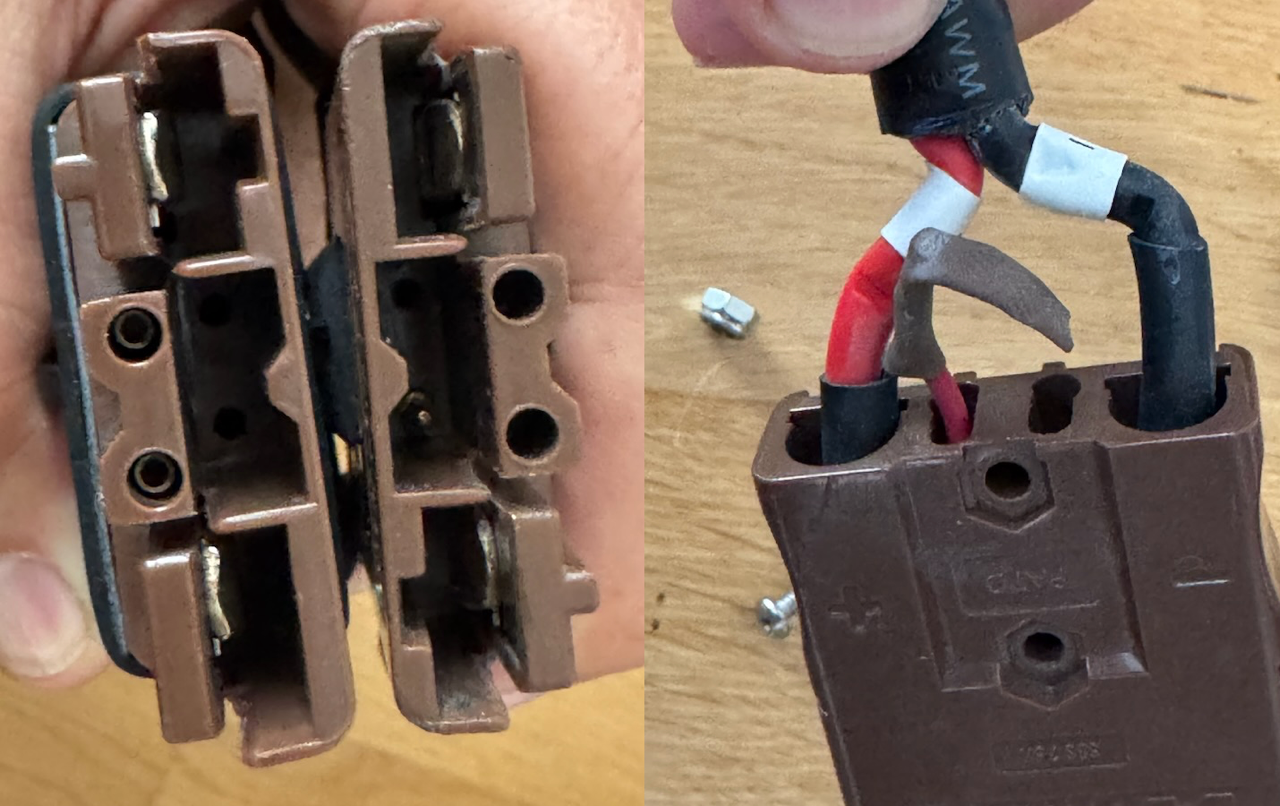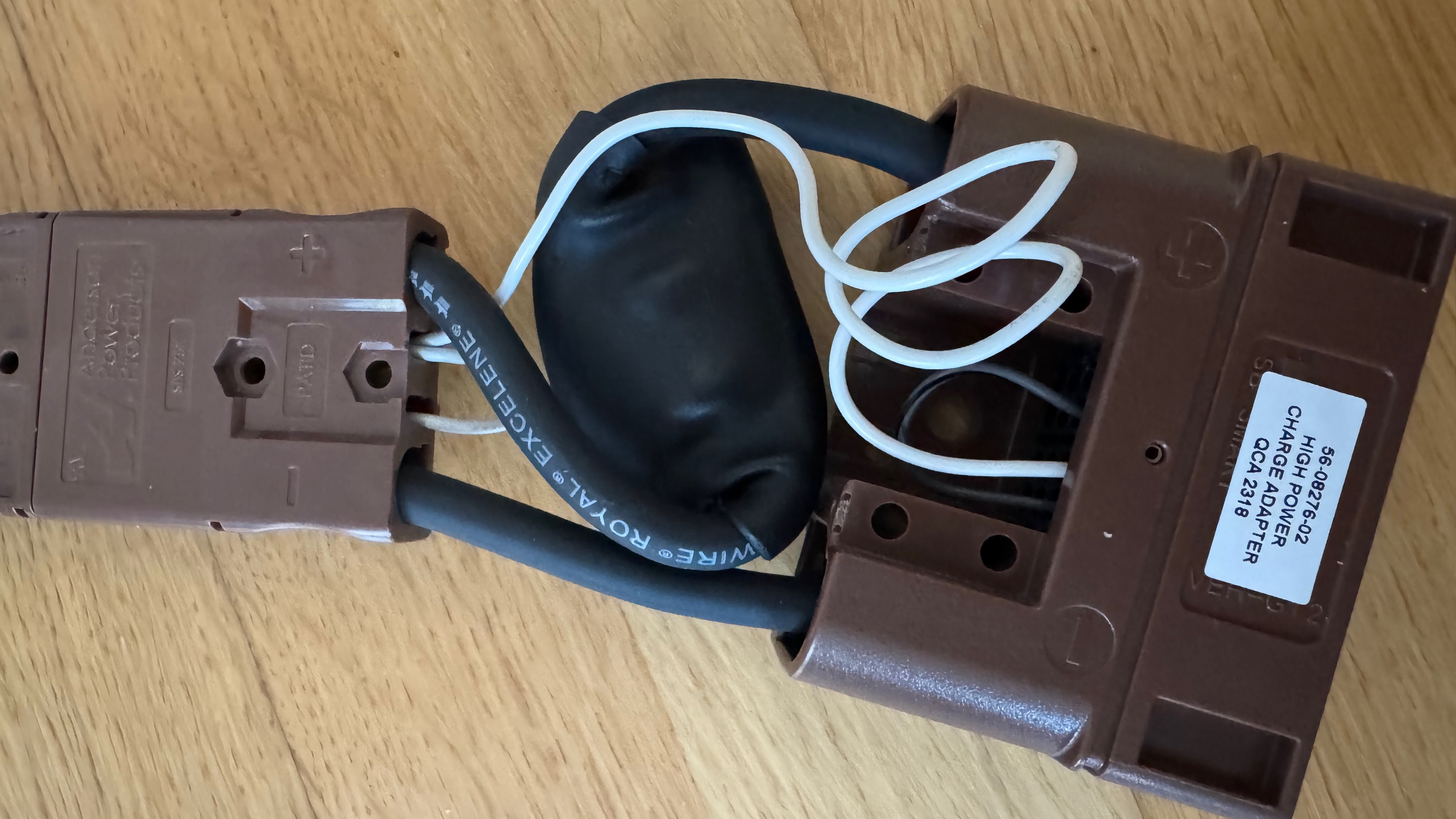 Ist auch drin... Habe den Schrumpfschlauch vorsichtig abgezogen, darunter verbirgt sich der Widerstand. Also habe ich auch mal den Adapter geöffnet: Man sieht die Sicherung in der Plus-Leitung. Das weiße Kabel verbindet den Signalpin (100kΩ) vom Lader mit dem oberen einzelnen Pin vom Batterie-Stecker, und ich konnte mit einem Multimeter da wirklich 100kΩ zu Plus messen. (Das graue Kabel verbindet die beiden unteren Pins.)MEroller hat geschrieben: Di 12. Aug 2025, 17:59 Es muss ein Widerstand von 100kOhm sein zwischen Haupt-Plus pin und dem kleinen Pin in der Mitte. Es sieht auf deinem unteren Bild so aus, als könnte das so verschaltet sein, nur kann ich mir nicht so ganz den Isolierbandzipfel erklären. Dort SOLLTE dieser 100KOhm Widerstand drin sein...