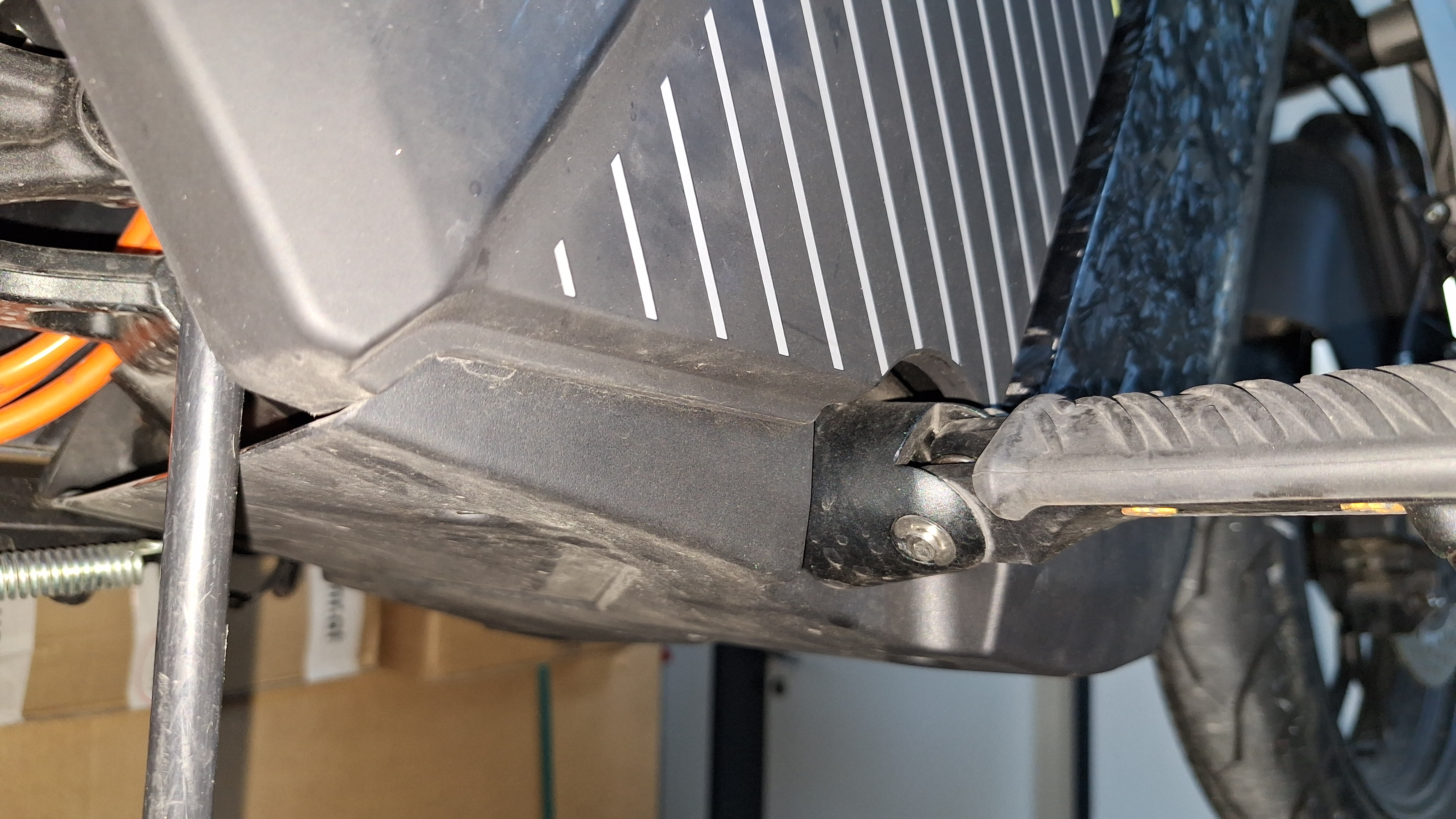 Wollte das Problem mit der unteren Abdeckung fixen. Da hab ich das Bike in der Firma an den Kran gehängt, damit ich leichter von unten dazu komme. Hatte aber leider keine passenden Torx-Schlüssel gefunden: