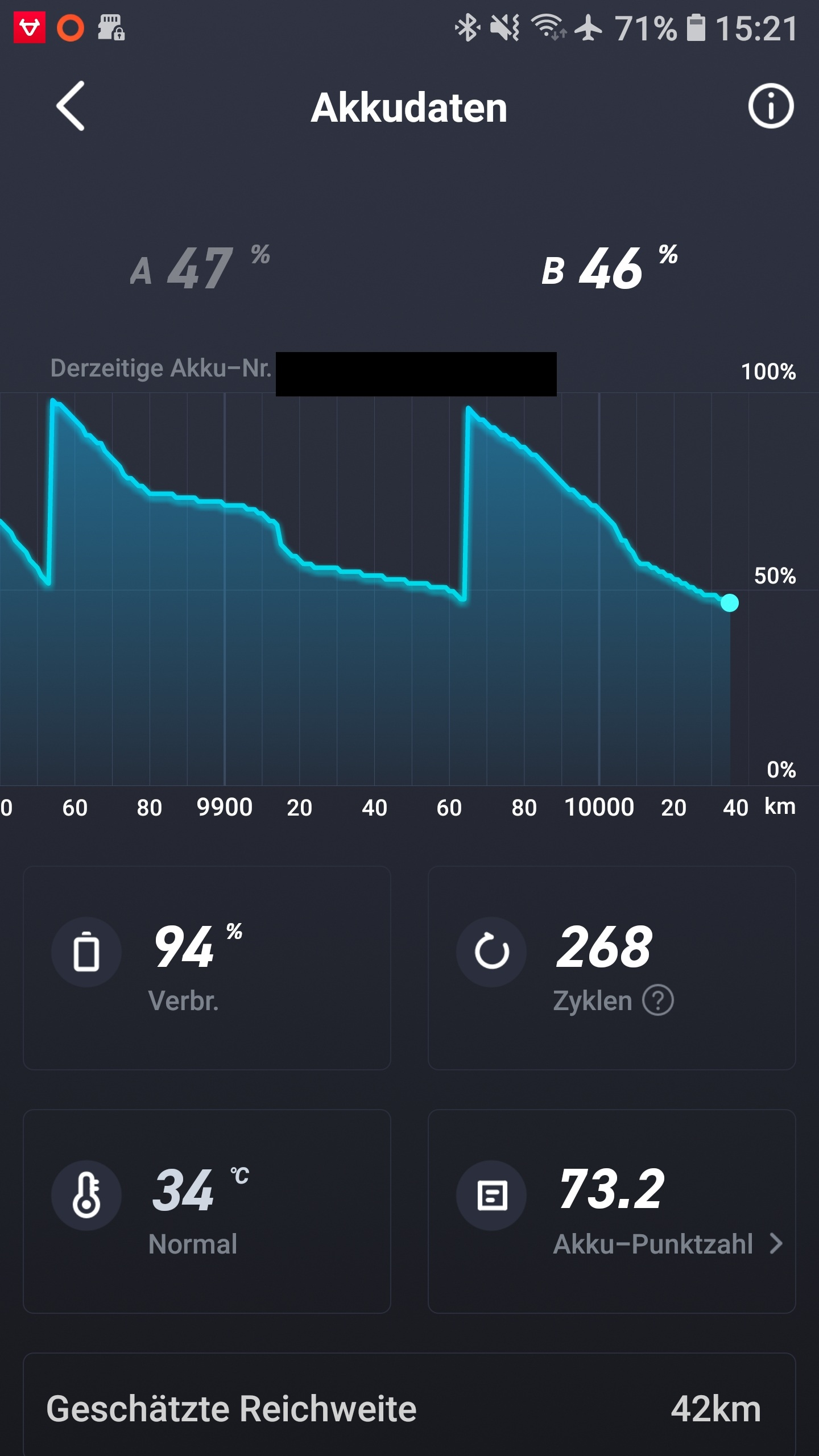 Die Akkus müssen noch nicht in Ruhestand, aber evtl. Altersteilzeit. Laut App reichen sie noch für 90 km. Im Mai bin ich mal 75 km (netto +260 Höhenmeter) am Stück gefahren und zuhause auf der Einfahrt hat der Akku dann bei 14% in Safe-Mode geschaltet. Aber für den Alltag noch lange brauchbar.