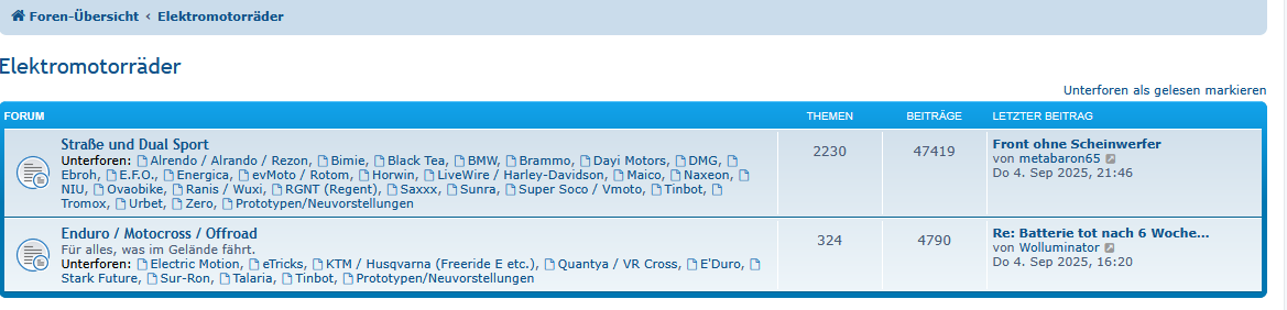 Leider wirft die phpBB Software dieses Forums diese Ordnung aus dem Fenster, wenn es das übergeordnete Forum "Elektromotorräder" anzeigt: