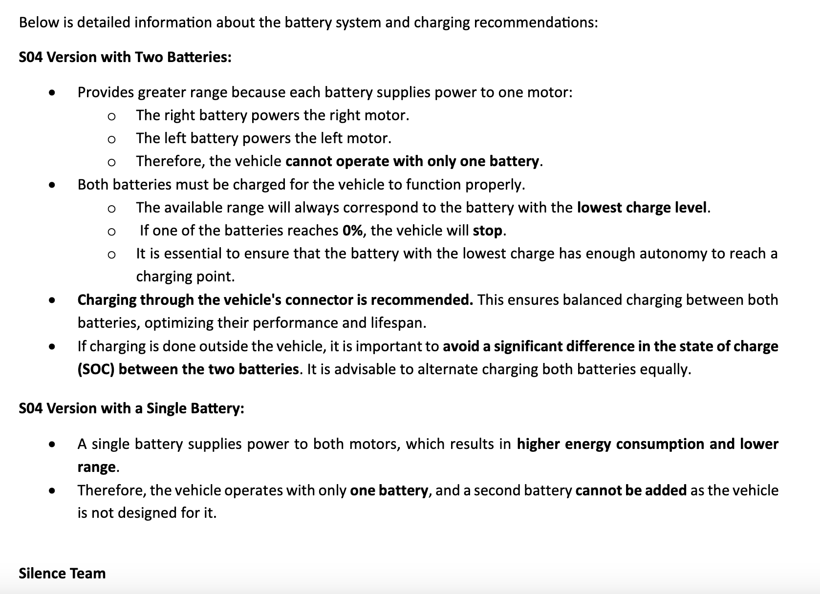 Oh Gott oh Gott.... das ist ja die denkbar mieseste Umsetzung die man sich vorstellen kann! Das heißt, Silence bürdet dem Nutzer auf, peinlichst genau darauf zu achten dass beide Akkus immer möglichst exakt gleich geladen sein müssen, damit du unterwegs keine Überraschungen erlebst...?! Das ist ja echt unterirdisch schlecht. Was für ein "Glück", dass ein Kauf eines S04 in der "großen" Variante und mit 2 Akkus wegen wahnwitziger Preisgestaltung bei mir ad Acta gelegt wurde.error hat geschrieben: Do 8. Mai 2025, 11:50 Silence sagt zu den beiden Versionen einduetig was geht (und nicht geht):
