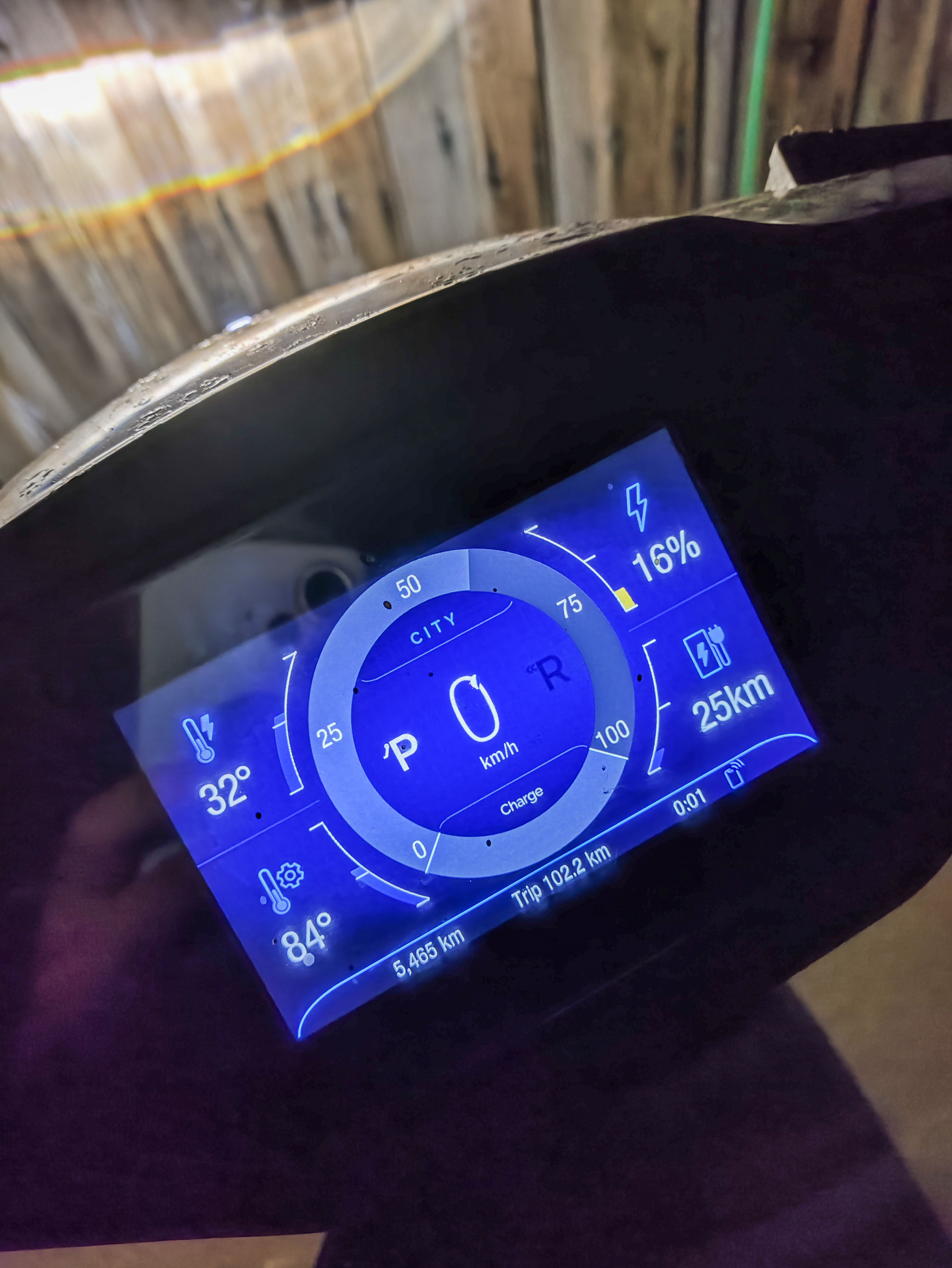 Bei ca 75% Landstraße und 25% städtischem Verkehr, hatte ich nach 102km immerhin noch 16 Prozent SoC.