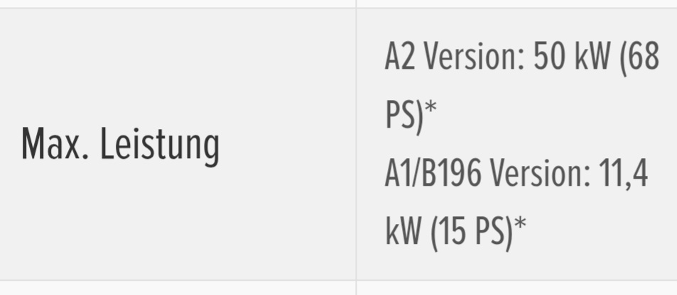 Was bedeutet es, wenn die A1 Version der WN7 hier "nur" 11,4 kW max. Leistung im Vergleich zur A2 Version mit 50 kW haben soll?