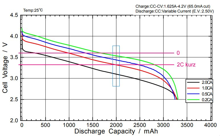 Zuerst hab ich mal die Leerlaufspannung vor meiner Berg-Belastung und die Spannung bei ~120 Ampere (2C) in mein geliebtes Panasonic 18650 Li-Ion Std Diagramm in rosa eingetragen. Dann hab ich den angenommenen Bereich auf der Kennlinie mit dem hellblauen Kasten markiert.