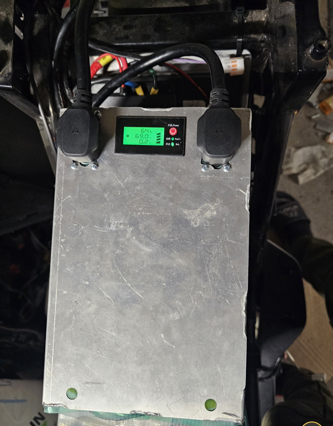Trotzdem zeigt die Evo 0% an, geht aber an und lässt sich im Schleichmodus fahrbereit schalten, mit 72V-Fremdladegerät versorgt, ohne echte Batterie.