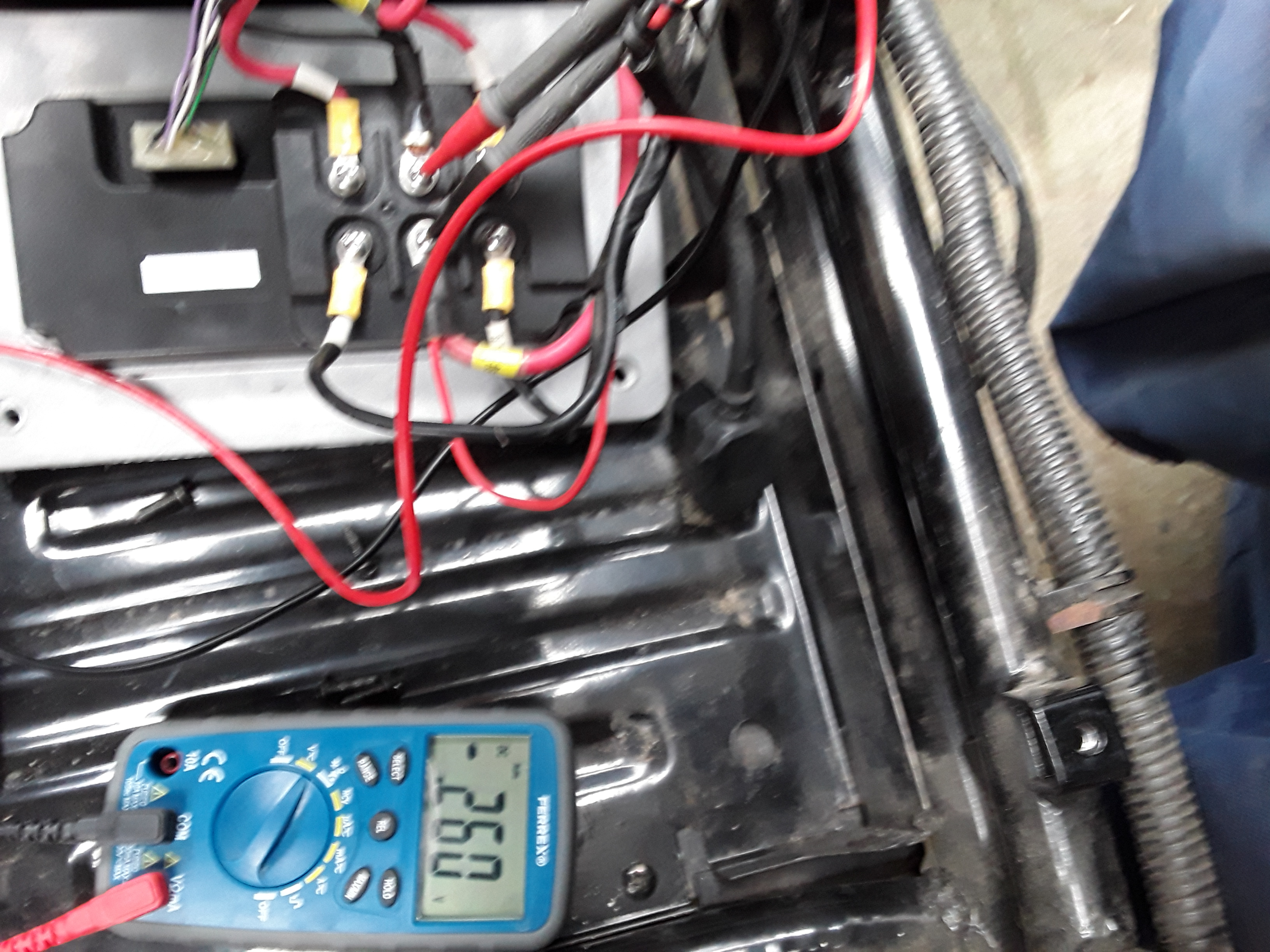 Jetzt würde ich am Controller nachmessen, das Teil unter dem Sitzfach, da geht ein recht fetter Stecker dran, evtl. noch ein kleinerer, und farbige dicke Kabel, einzeln verschraubt. Hier interessieren nur rot und schwarz, die anderen Farben sind für die "Motorphasen". Ebenso sollte auf dem Controller eine Streifensicherung sitzen, also eine fette Schmelzsicherung.