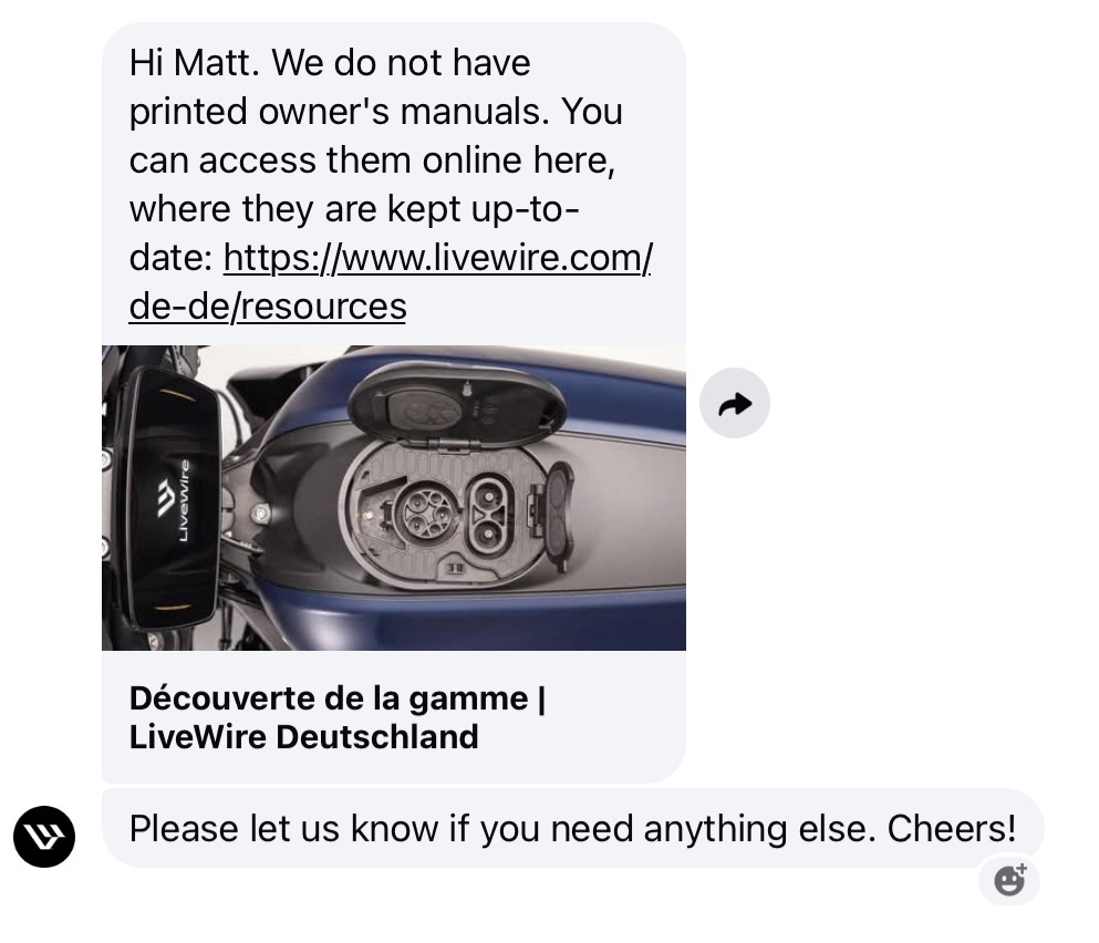 Ich habe mich an LiveWire gewandt. Per Mail haben sie nicht reagiert, aber auf Facebook (bzw. Messenger) gabs dann sehr schnell die Antwort: