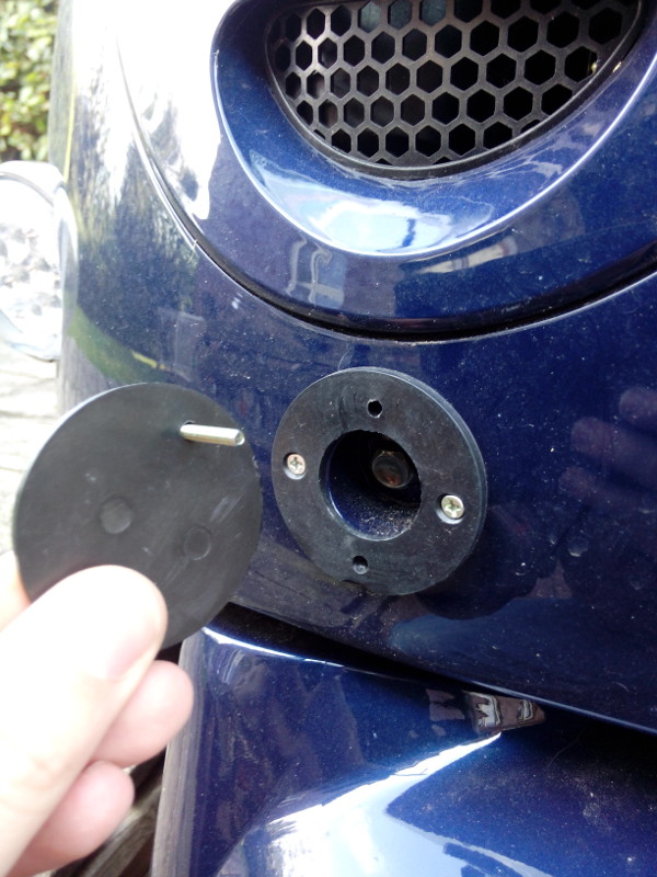 Hinter dem Logo verbirgt sich die Schraube, welche man lösen muss, um zumindest erst einmal an die Glühlampen (Scheinwerfer) zu kommen und später weiter, um nach ein paar mehr Schrauben, die gesamte Frontverkleidung zu entfernen. Also ist ein nicht fest verklebtes Logo recht sinnvoll.