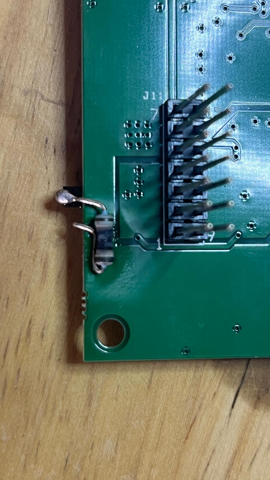 Nach Demontieren der Einheit zeigt sich auf der unteren der beiden Platinen ein etwas wild "hinzugelöteter" vermutlicher Vorwiderstand, der durchgebrannt ist. Aufgrund dessen leider nicht mehr erkennbar, welchen Wert er hatte.