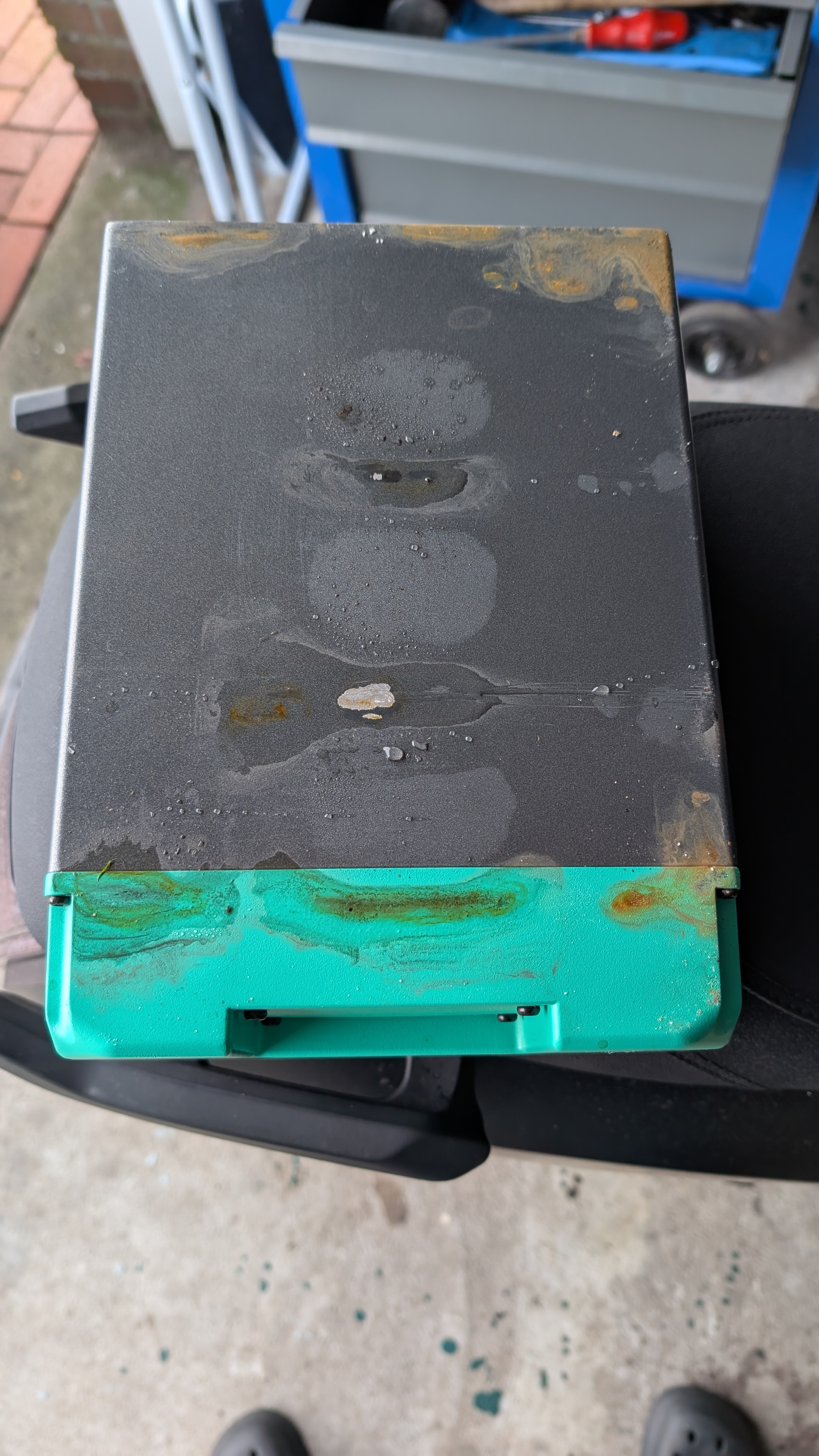 Während ich die Akkus ausgebaut habe, da ich zur Zeit keine Verbindung zum Roller aufnehmen kann, ist mir ein unschöner Zustand aufgefallen. Die Akkus und der Roller im inneren sind Nass und es fängt an leicht zu blühen. Also Rost habe ich versucht weitestgehend zu entfernen und habe die stellen mit Owatrol behandelt.