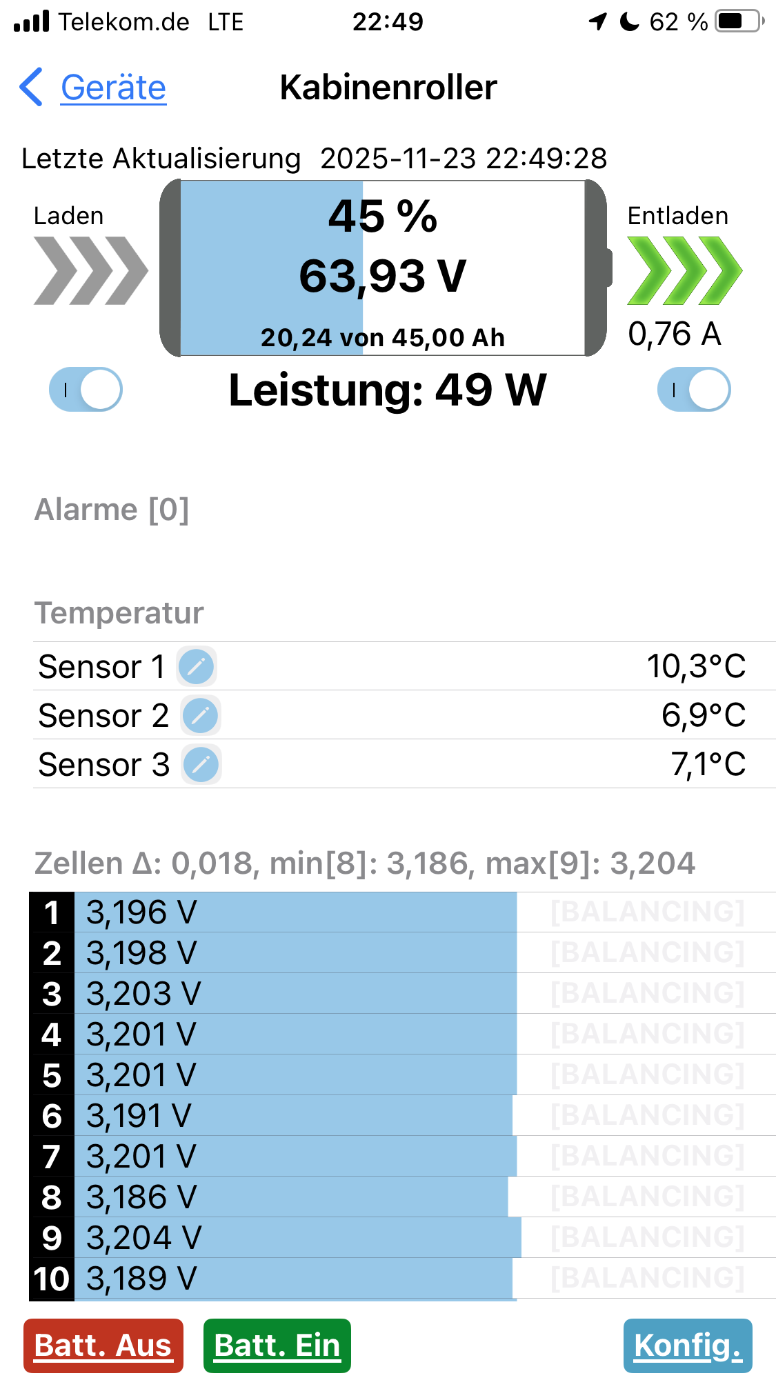 Ah! Ich habe kein Display, weil das BMS Bluetooth hat.MEroller hat geschrieben: Mo 24. Nov 2025, 22:54In Deinem Pack ist wohl auch ein BMS drin ist? Du hast ja kein Display mit Knöpfen dran wie in dem Video, aber wenn es auch ein BMS mit MOSFETs ist, welches den Lade- bzw. Entladestrom stoppen kann, wirst Du von außen keine Batteriespannung messen können, wenn das BMS nicht durchschaltet.