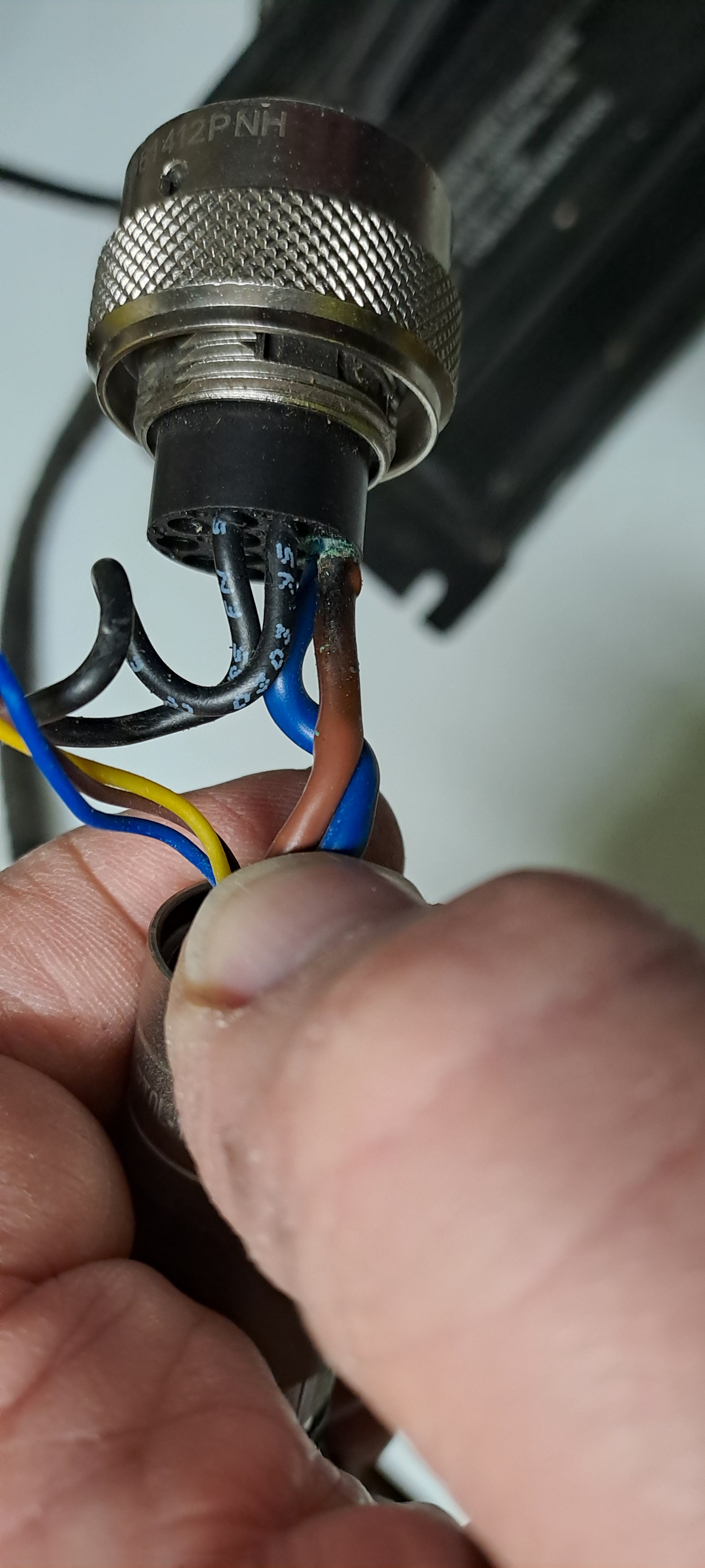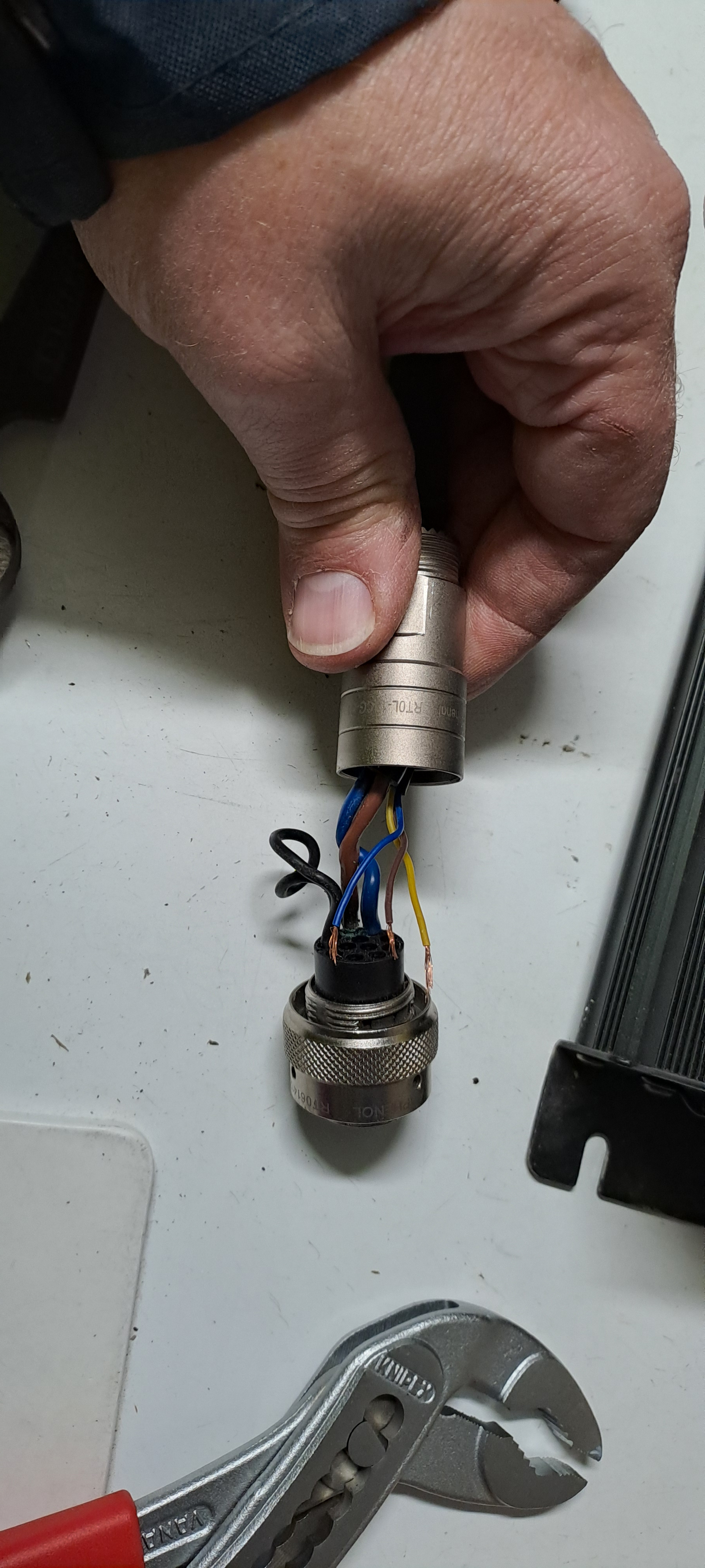 Der Amphenol Stecker war ab Werk falsch zusammengebaut, somit gibt es keine Zugentlastung. Das schwarze Plastik Teil gehört anders herum rein, damit durch den Konus im Deckel auch die Lamellen zusammengedrückt werden können.