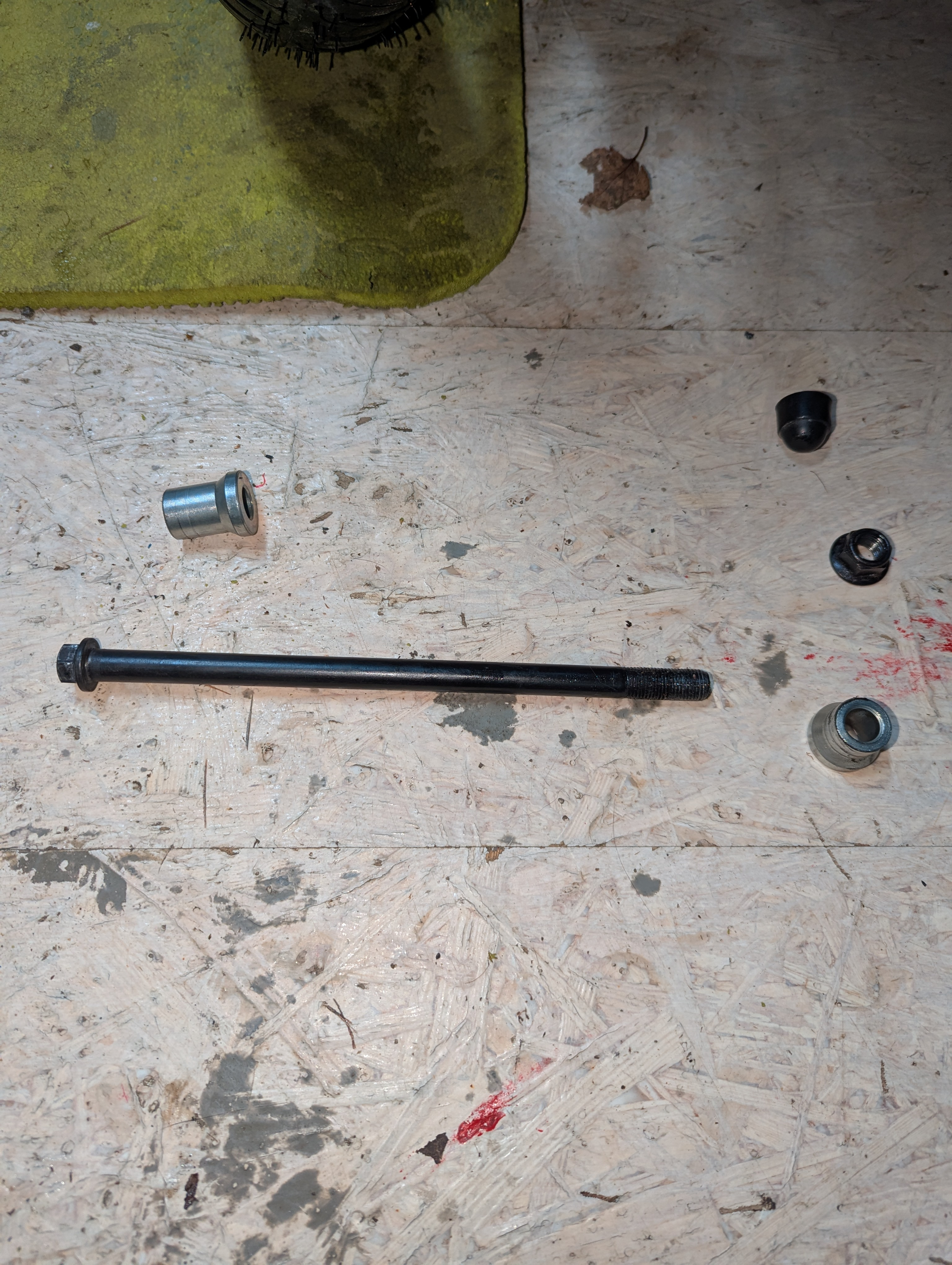 - Eine Unterlage. mobilze.ch nimmt eine zersägte Europalette. Hatte ich keine mehr da, aber noch ein paar 4x6er Balkenreste. Irgendwas halt, wo man das Rad drauf legen kann, ohne daß dann die Achse oder die Bremsscheibe Schaden nimmt, wenn man sich mit seinem ganzen Körpergewicht reinlegt.