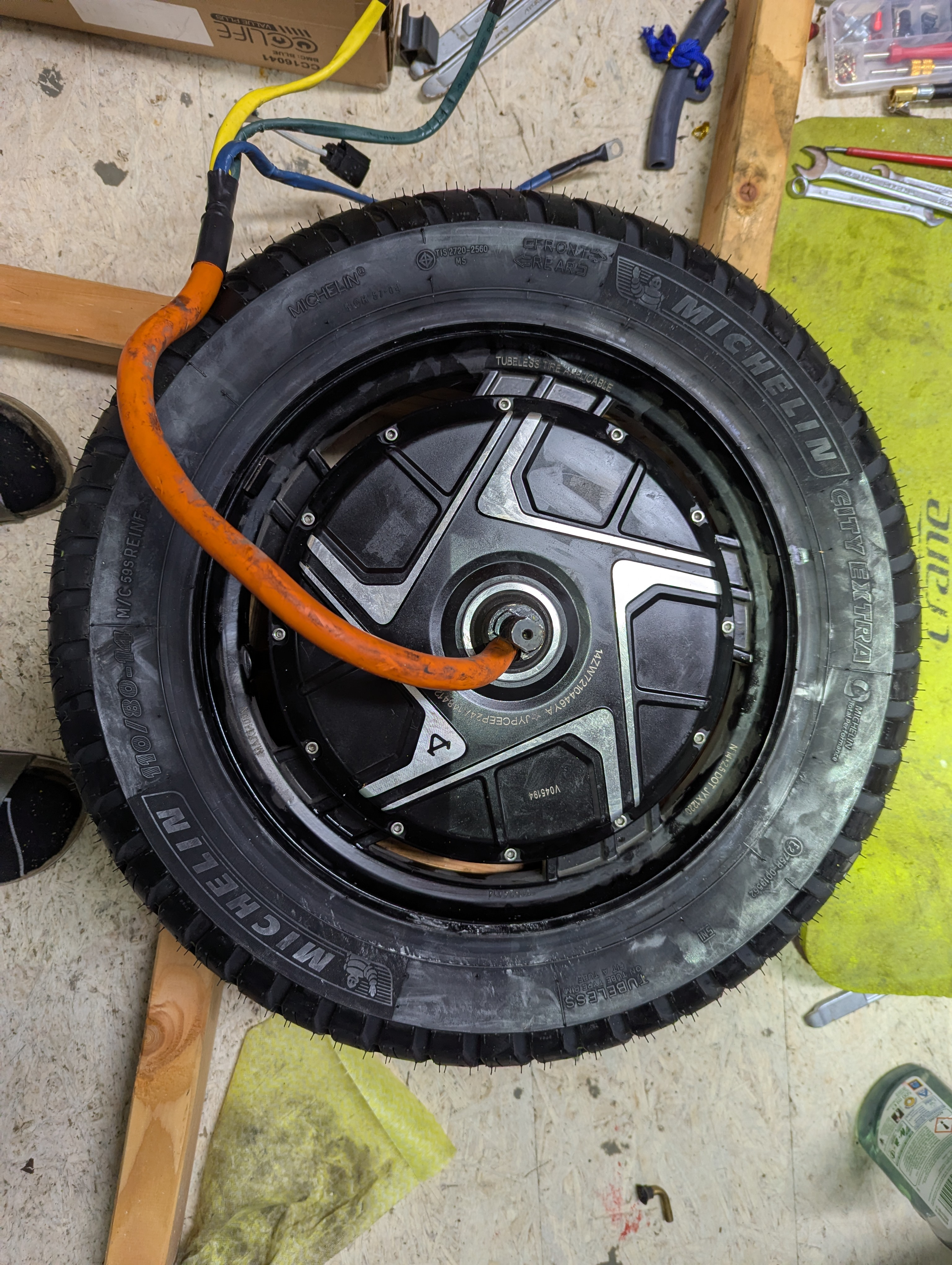Vor dem Zusammenbau vielleicht die neu bereiften Räder mit dem Gartenschlauch abspritzen, um das überflüssige Spülmittel los zu werden, und alles, was an Fett oder Dreck auf die Bremsscheiben gekommen ist, mit etwas Bremsenreiniger abwischen.
