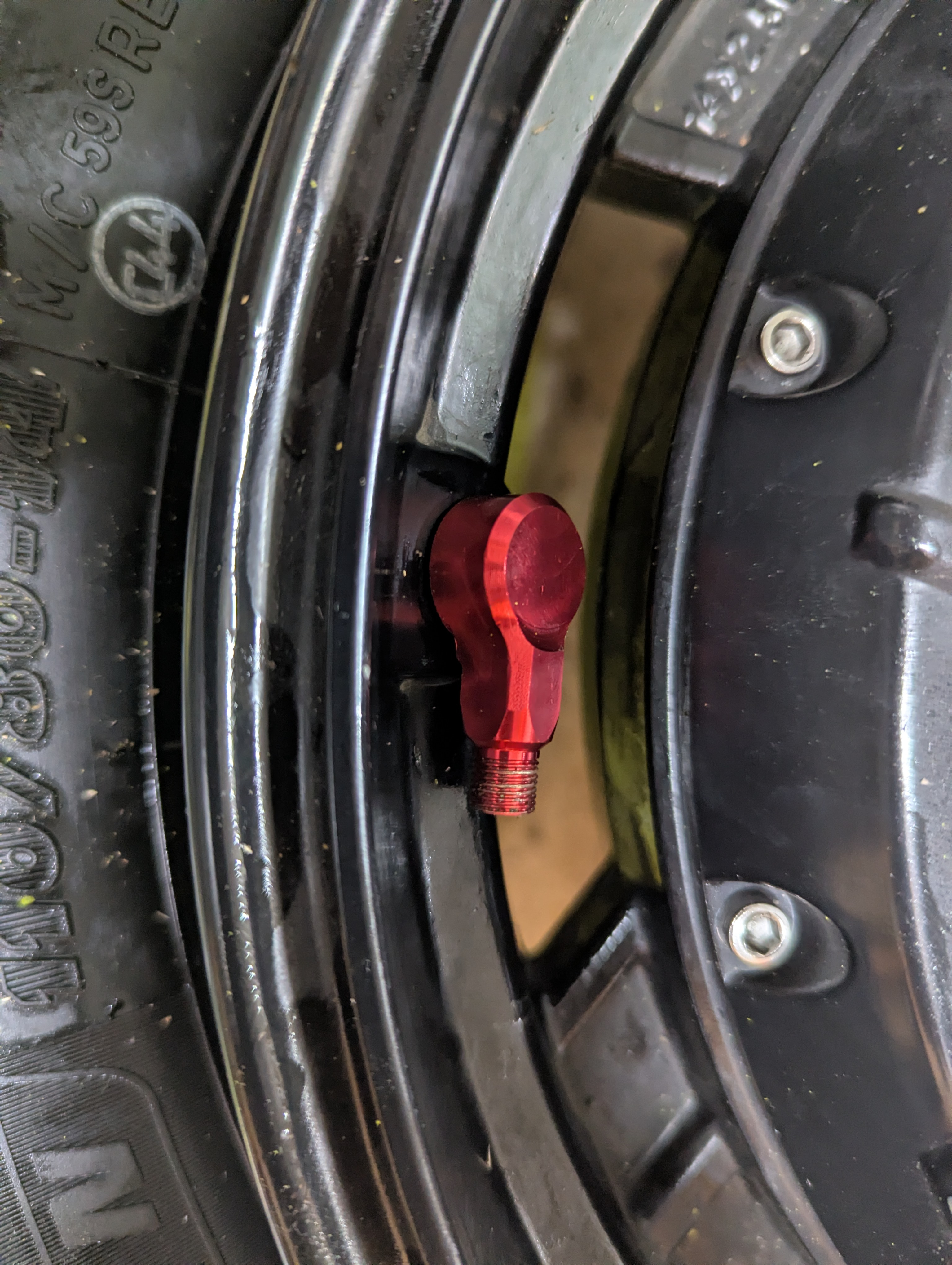 Durchmesser (11,3 mm) und Gewindelänge passen - aber wenn ich es wie auf dem Bild nach unten (oder oben) zeigen lasse, komme ich mit dem Luftanschluß nicht dran, wenn ich es nach rechts (zum Motor) drehe erst recht nicht, und nach links (zur Felge hin) ist die Felge im Weg. In der gezeigten Position kann ich so knapp die Kappe drauf schrauben, aber das wär's schon gewesen.