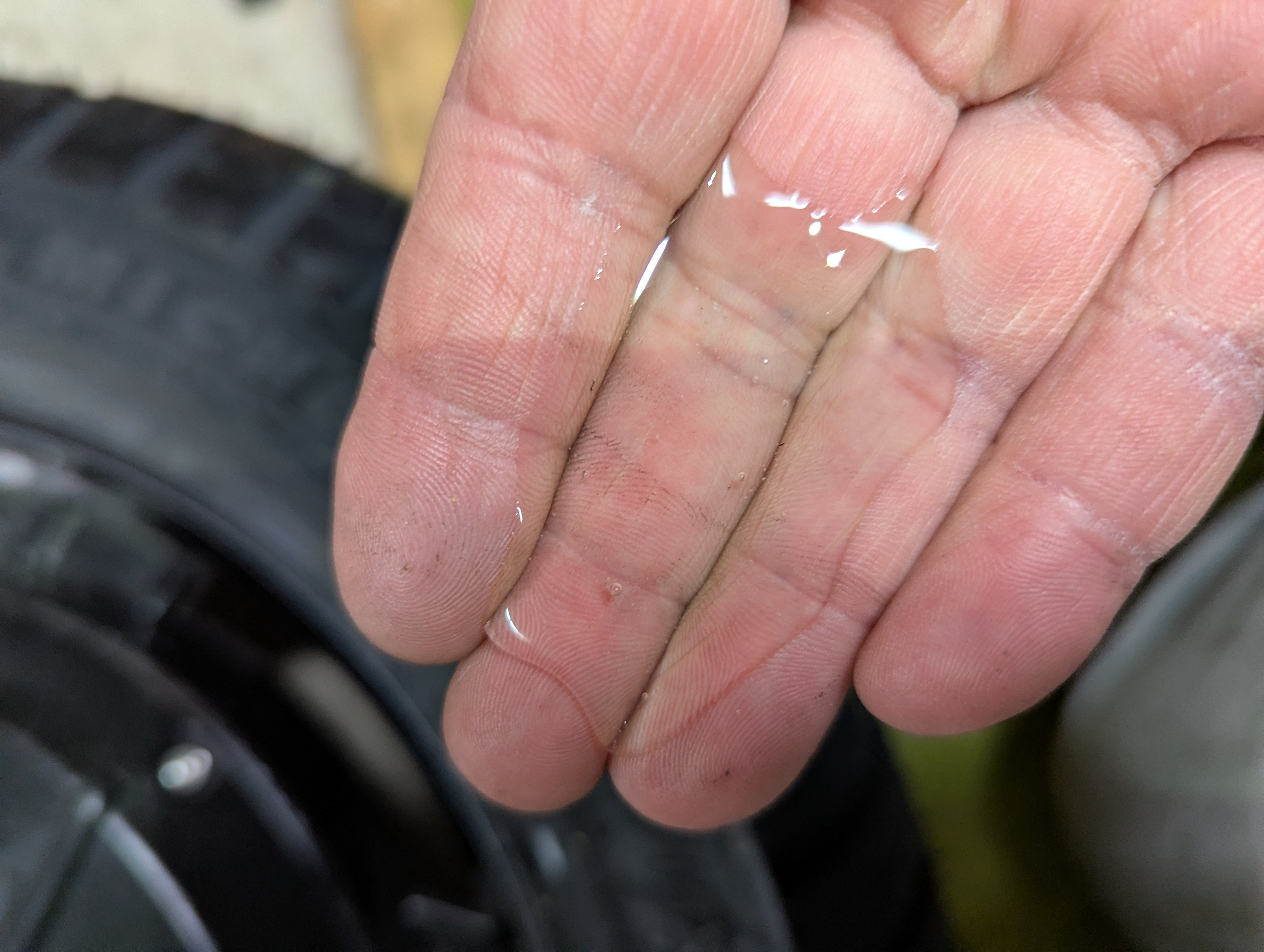 Vor dem Zusammenbau vielleicht die neu bereiften Räder mit dem Gartenschlauch abspritzen, um das überflüssige Spülmittel los zu werden, und alles, was an Fett oder Dreck auf die Bremsscheiben gekommen ist, mit etwas Bremsenreiniger abwischen.