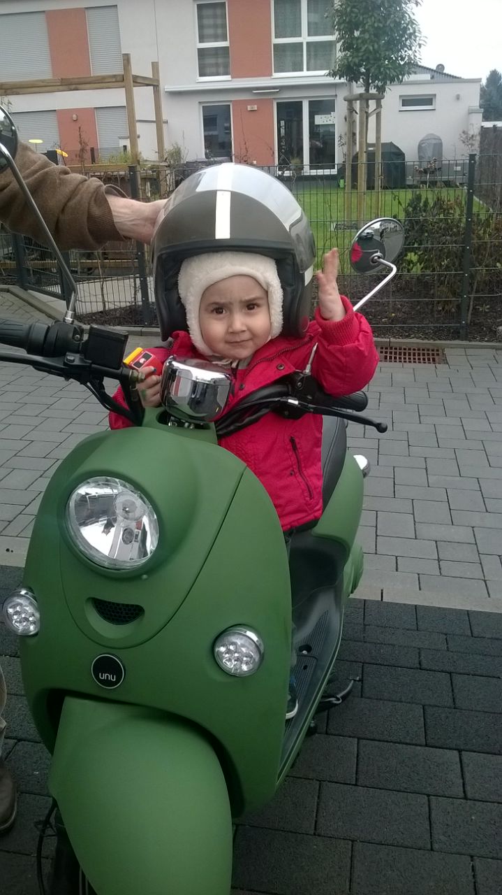 Bin neu im Forum und seit einigen Wochen stolzer Besitzer eines UNU 2000W. Hier mein Sohn beim Test des UNU nebst Helm. Der Original Bw-Krad Helm (sehr robust aber etwas schwer) passt zum dezenten BW-oliv. Man wollte heute schon meinen Fahrbefehl kontrollieren