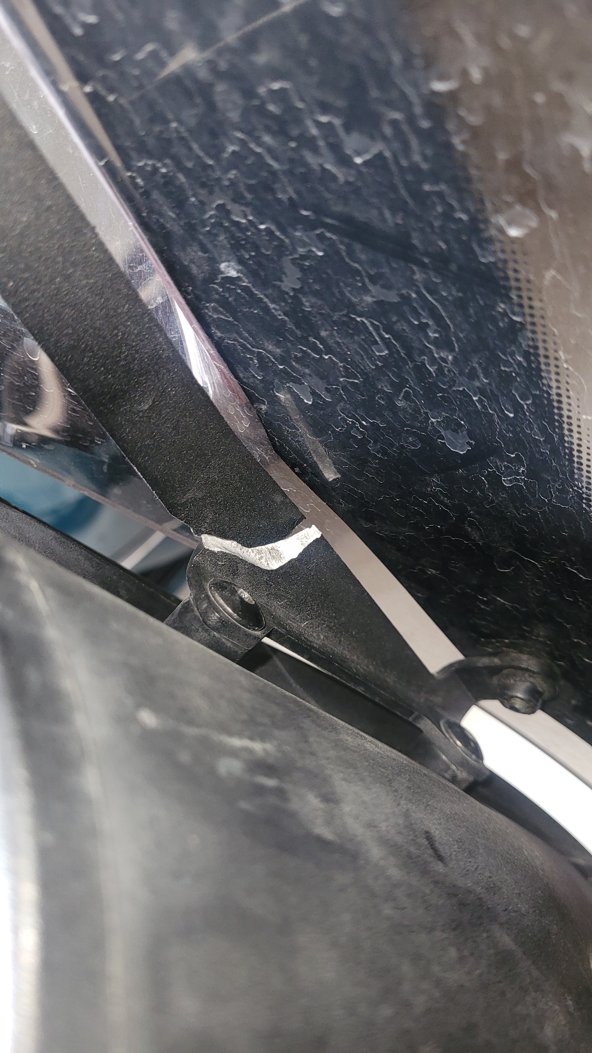Mir ist gestern "einfach so" beim großen originalen Silence-Windschild (das ja von Puig ist) auf einer etwas holprigeren Straße die Halterung gebrochen. Siehe Bilder. Also richtig schlimm war die Straße gar nicht, halt beschädigter Asphalt mit leichten Schlaglöchern, eine viel befahrene Innerort-Straße hier. Mir war das ehrlich gesagt von Anfang an etwas suspekt, denn diese Halterungen sind Aluguss, und nachdem die Federung vorn ja bekanntlich nicht so toll ist, geht da einiges an Schwingbelastung in das Schild und die Halterung.