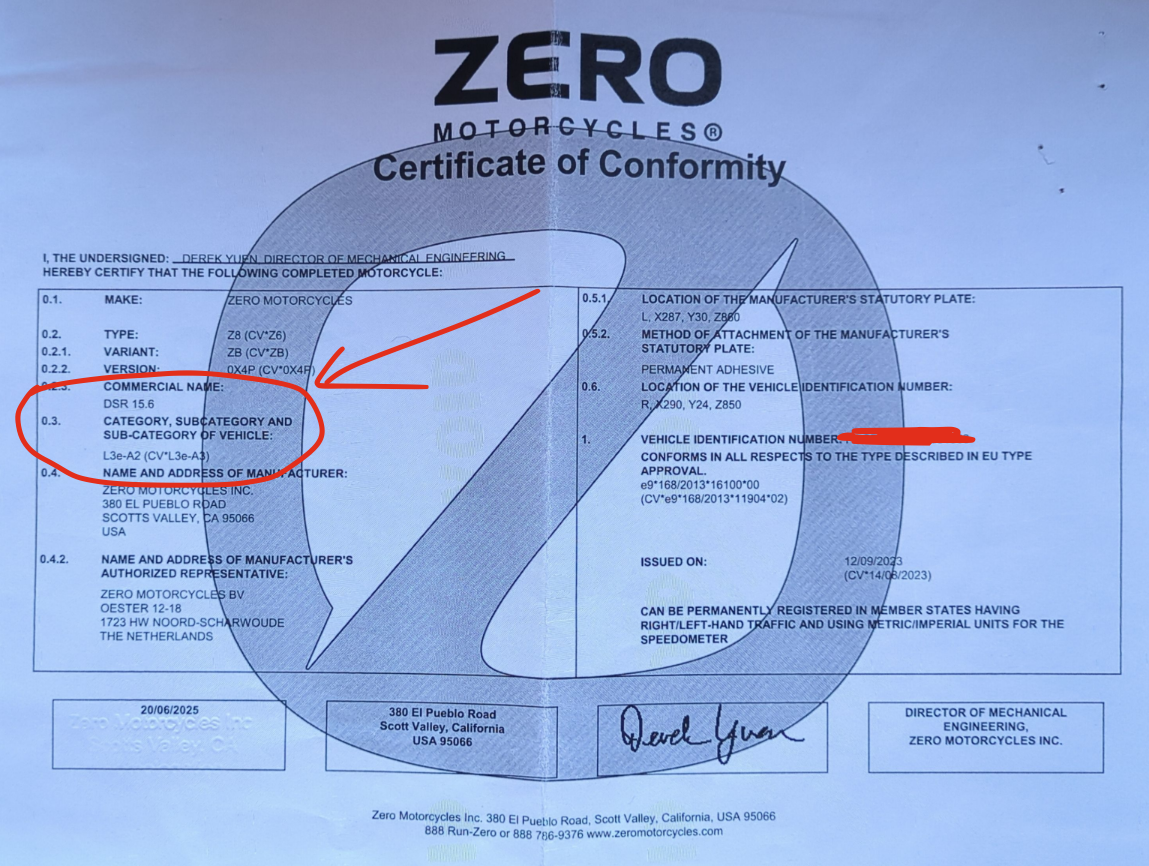 Ich drücke dir die Daumen, dass du es aufgrund der 35kW auch als A2 anmelden kannst. Allerdings bezweifle ich, dass das funktioniert, denn du brauchst dafür das CoC Papier von Zero und solange dort L3e-A3 unter Ziffer 0.3 eingetragen ist, wird sie wohl nicht als A2 zugelassen. (*)