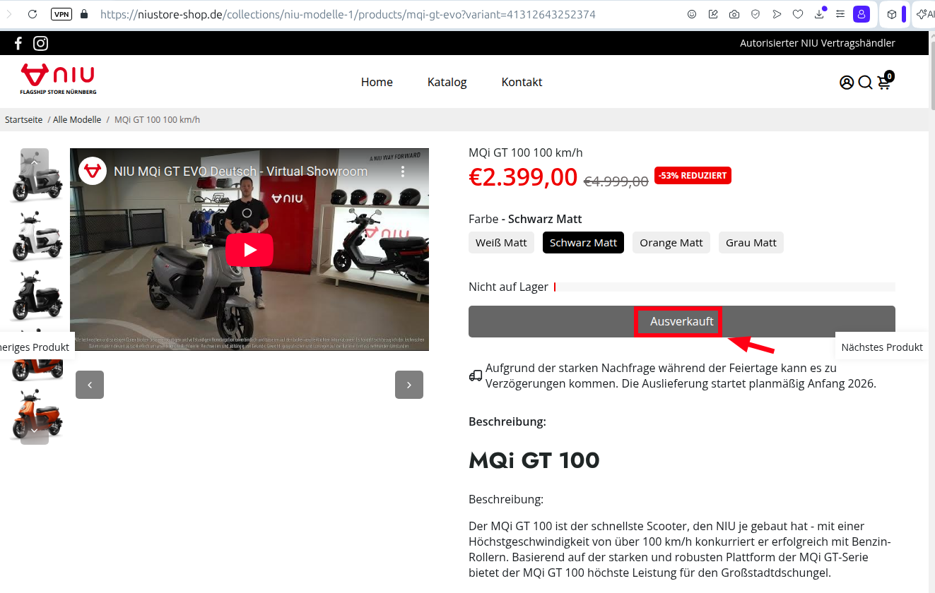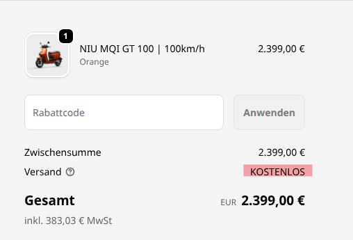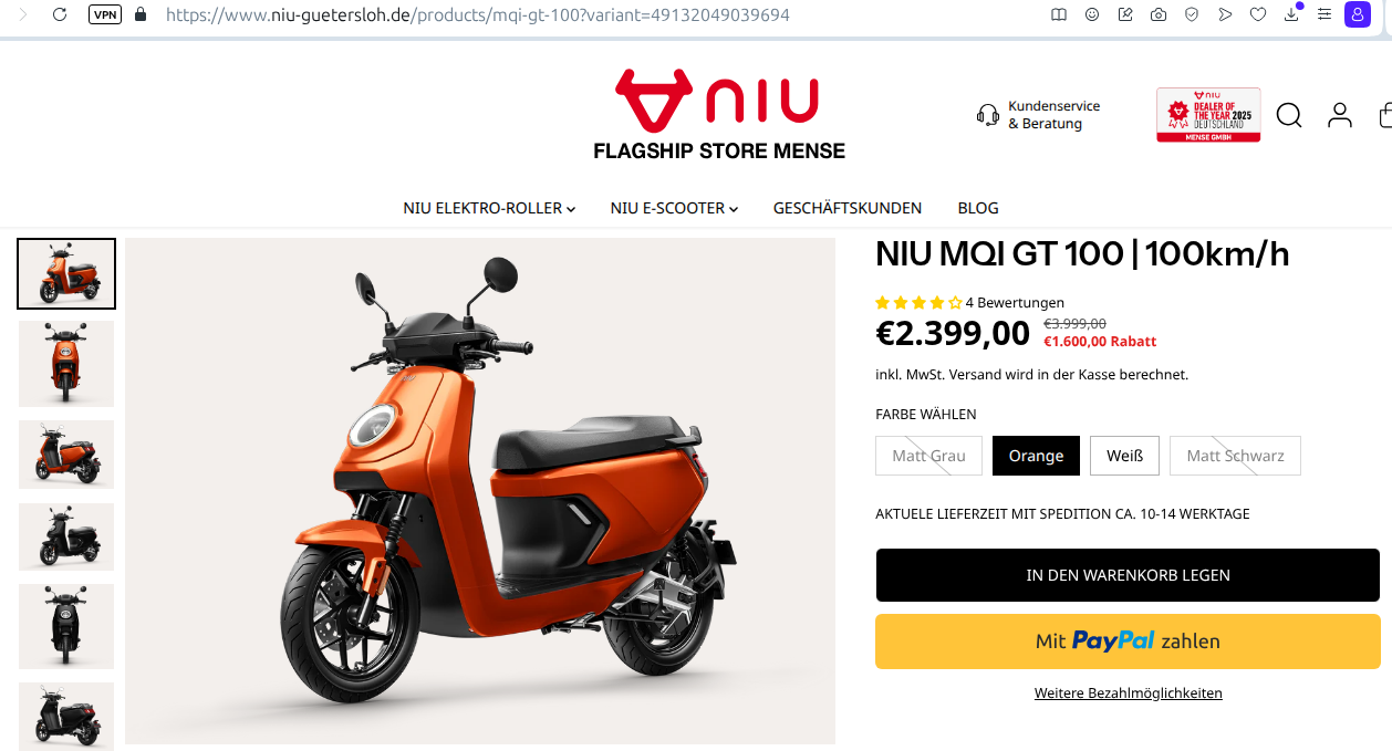 Ist nun bereits ausverkauft im Nürnberger NIU-Store.Basti80 hat geschrieben: Mi 7. Jan 2026, 12:19 Aktuell gibt es den Nachfolger MQi GT 100 für 2.399 EUR zu kaufen. Hier z.B.: https://niustore-shop.de/collections/ni ... 1058915478