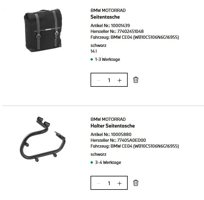 ich hole das Thema hier nochmal hoch, weil ich mich jetzt versucht habe durch den ganzen "Taschen, Koffer und Halterungen" - Thread zu lesen, aber gen nochmal die finale Bestätigung hätte: Ich möchte eine Seitentasche für meine CE04, und dazu brauche ich zum einen den entsprechenden Halter, an den dann aber nicht nur die "original" für die CE04 angebotenen BMW-Taschen passen, sondern auch Taschen wie die NineT... weil das Befestigungssystem von BMW grundsätzlich kompatibel ist, sofern Taschengröße und -form an den vorhandenen Platz passen.... ist das so richtig zusammengefasst? Wäre also die Kombination wie im Bild möglich?!