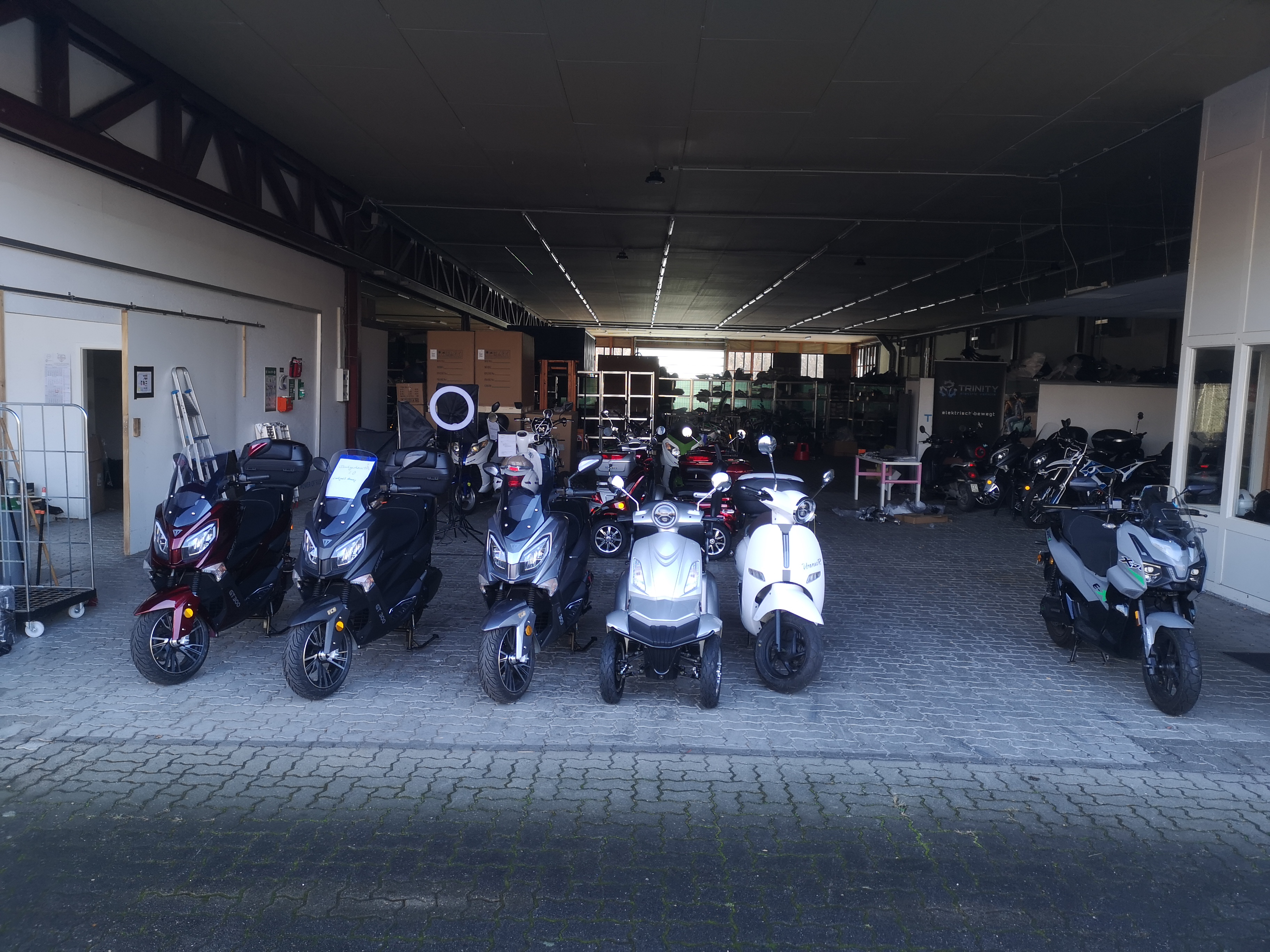 Letzte Woche war ich bei Trinity electric vehicles. Möglicherweise ist die Firma der älteste Importeur chinesischer Elektroroller in Deutschland, der die Höhen und Tiefen überstanden hat und immer noch existiert. Eigentlich wollte Reinhold Richert E-Motorräder verkaufen. Aber es entstand eine kleine Modellpalette solider Chinaroller, die es so oder ähnlich auch bei anderen Anbietern zu kaufen gibt: Romex, Uranus/ Neptun / Venus, Jupiter. Allerdings hat Trinity nach Möglichkeit Verbesserungen in die Fertigung eingebracht, so dass die Modelle oft etwas teurer waren als andere. Vor allem in größere Controller und stabil hohe Leistung wurde investiert. Außerdem wurden die Modelle kontinuierlich weiterentwickelt. Das kann man am aktuellen Jupiter GT300 am deutlichsten erkennen viewtopic.php?p=421865#p421865.