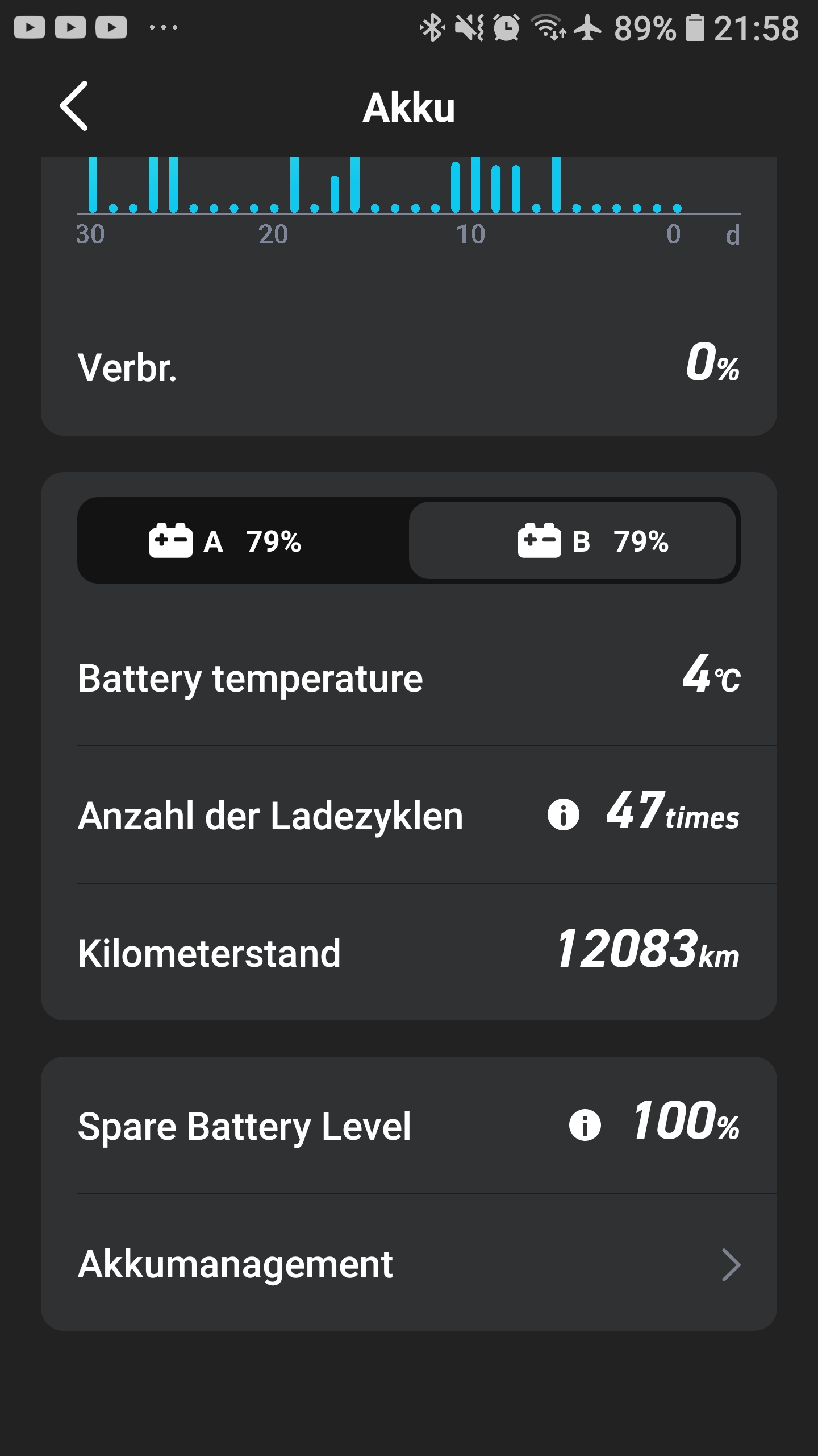 Die Kapazität hat sich in der Zeit nicht verändert. Sie ist bei 79% geblieben. Bin Sonntag früh runter und habe ne Fahrt zum Bäcker gestartet. Alles wie gewohnt ( außer beim Bäcker, rappel voll der Laden, naja, Sonntag halt ). Ich dachte immer der Akku entlädt sich wenn er steht. Bei meinen alten Akkus 60V 35 Ah ist das so. bei denen nicht. Versteh ich nicht. Hat ein anderer so etwas auch schon beobachtet?