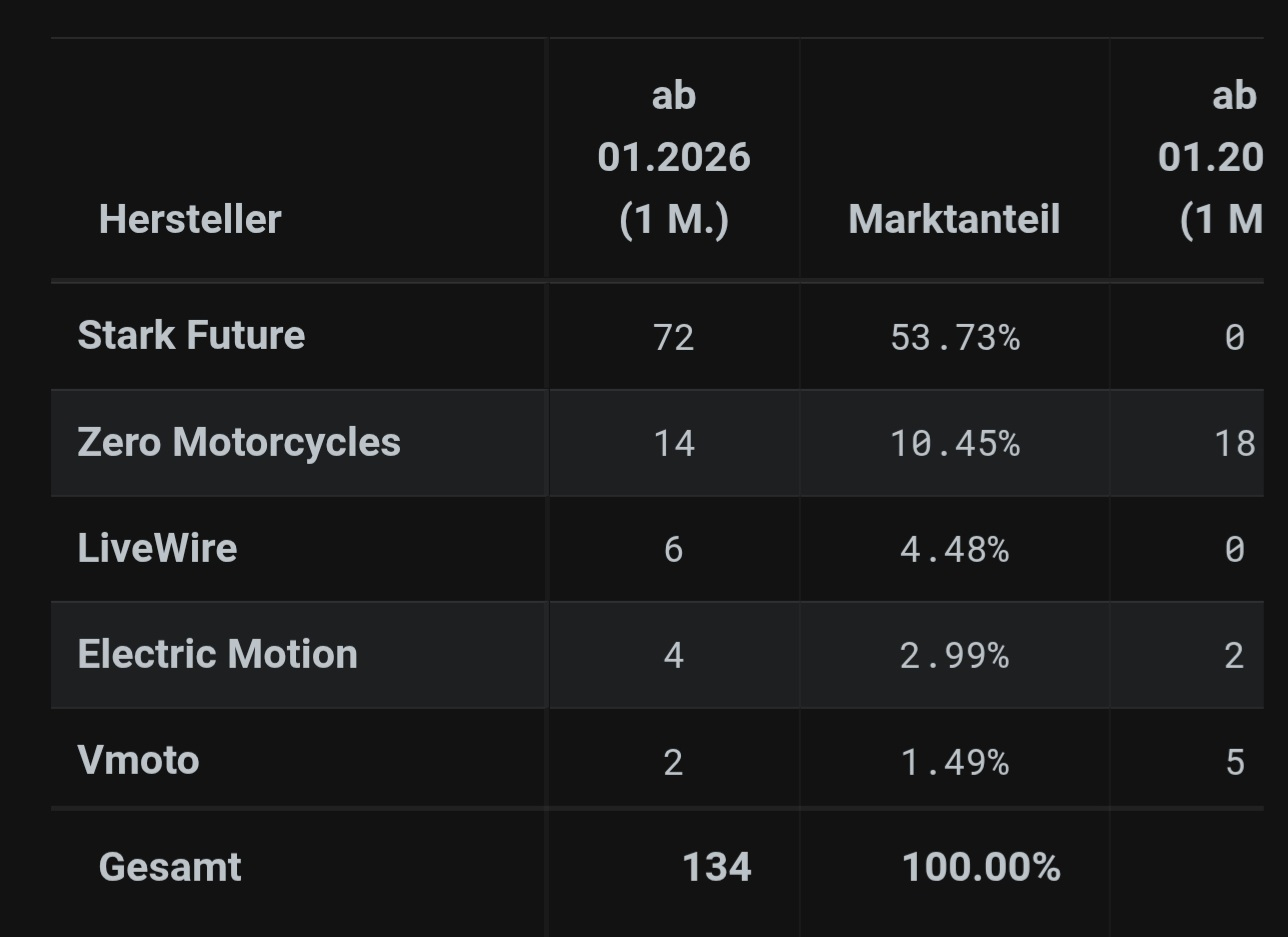 72 Stark und 14 Zeros im Januar neu zugelassen. Nix gegen Zero, aber im Moment hat Stark die meisten Neuzulassungen. Und das Verhältnis fand ich jetzt eher krass.