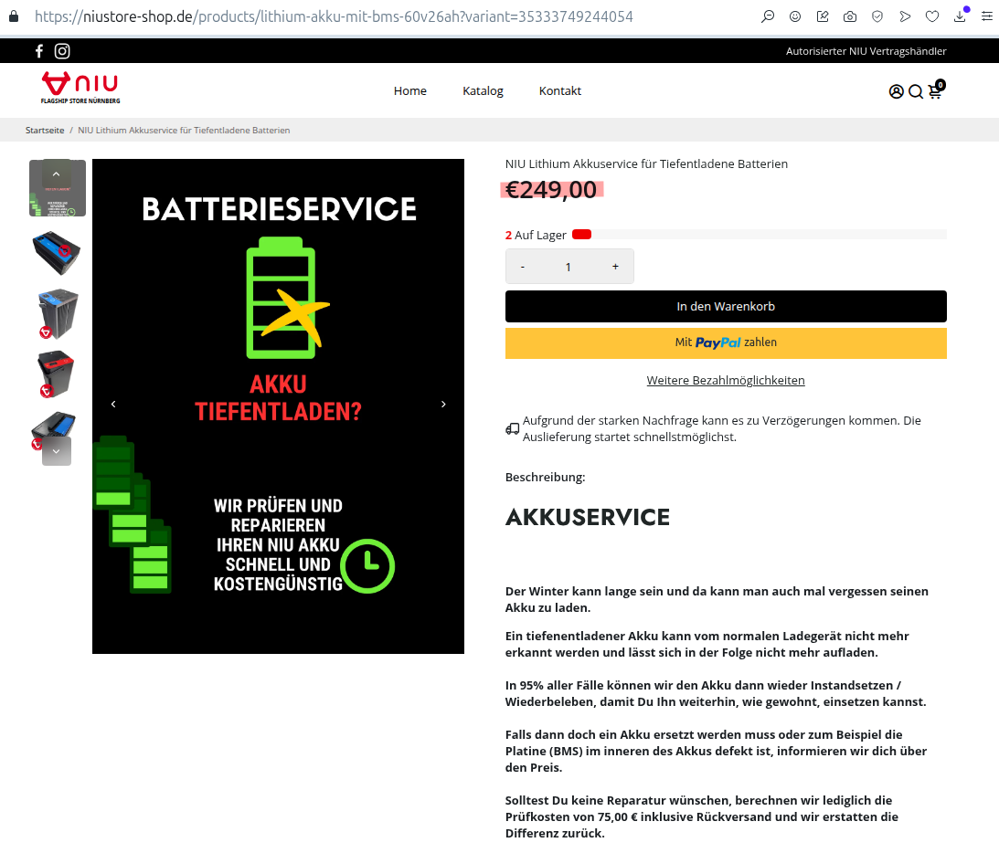 Weil ich es kürzlich bei NIU Nürnberg las: Sie bieten einen Reparaturservice für tiefentladene oder aus sonstigen Gründen funktionsuntüchtige Original-Akkus für 250 € an. Wird die Reparatur vom Kunden im nachhinein abgelehnt, wird nur eine Servicepauschale von 75 € berechnet.
