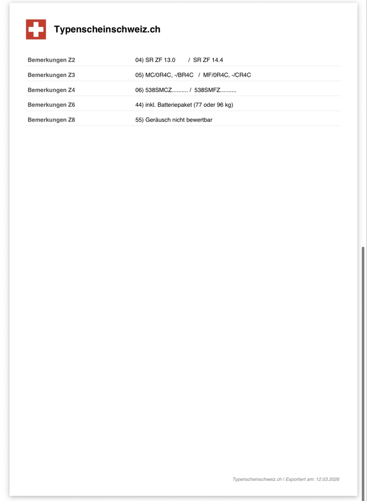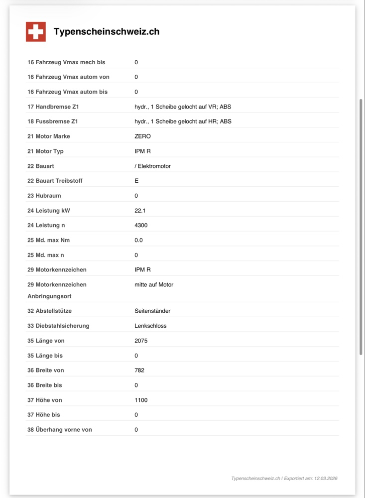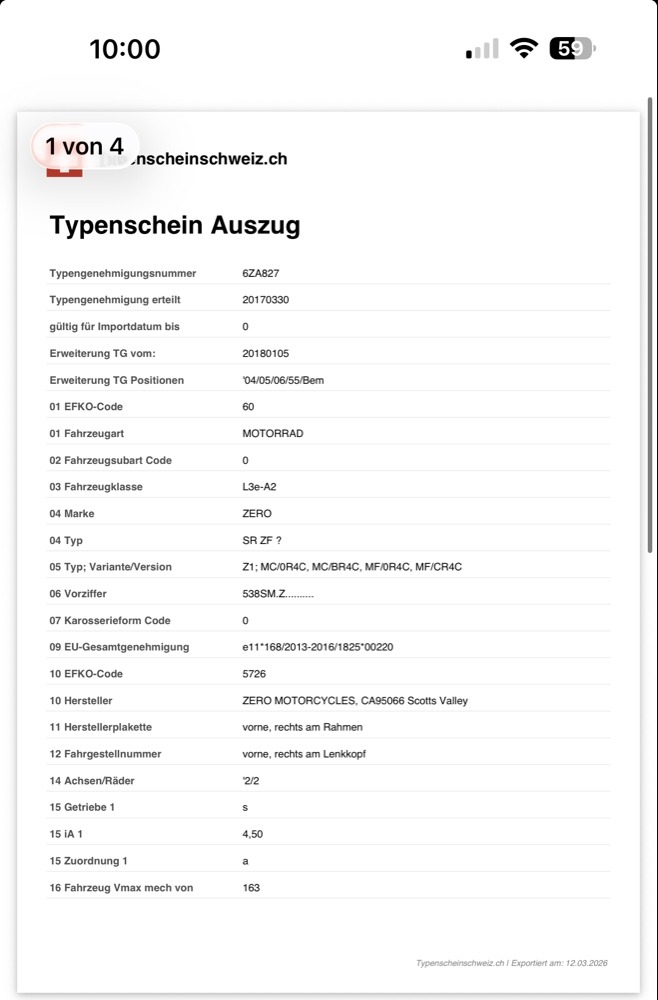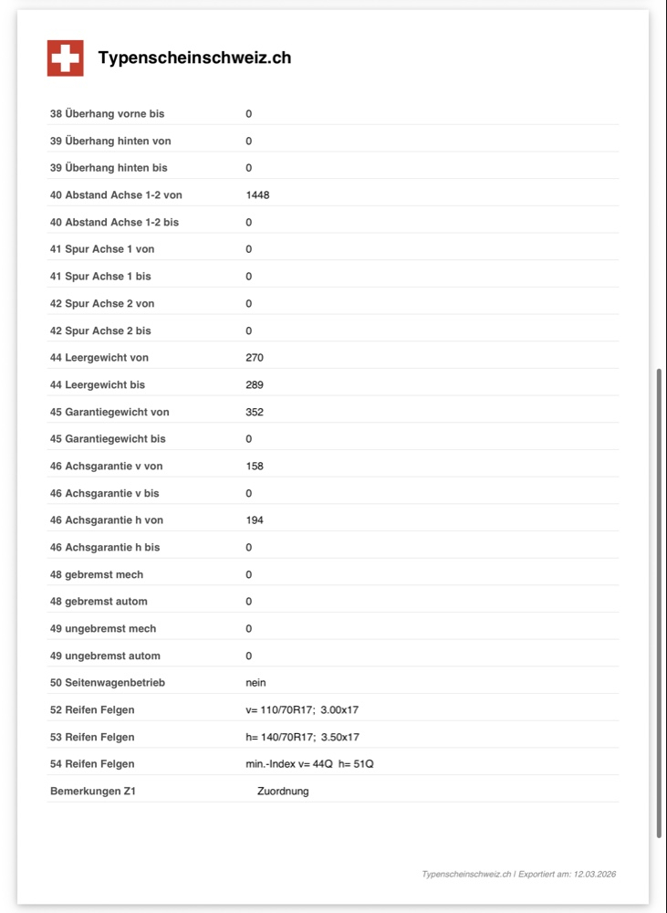 Unter Ziffer 52/53 steht bei der TG 6ZA827 explizit das "R" (110/70R17 / 140/70R17). Die Zero SR ist also offiziell auf Radialreifen homologiert in der Schweiz. Ich wechsle jetzt auf den Michelin Road 6. Damit passt die Bauart perfekt zum Papier und zur Power der SR.