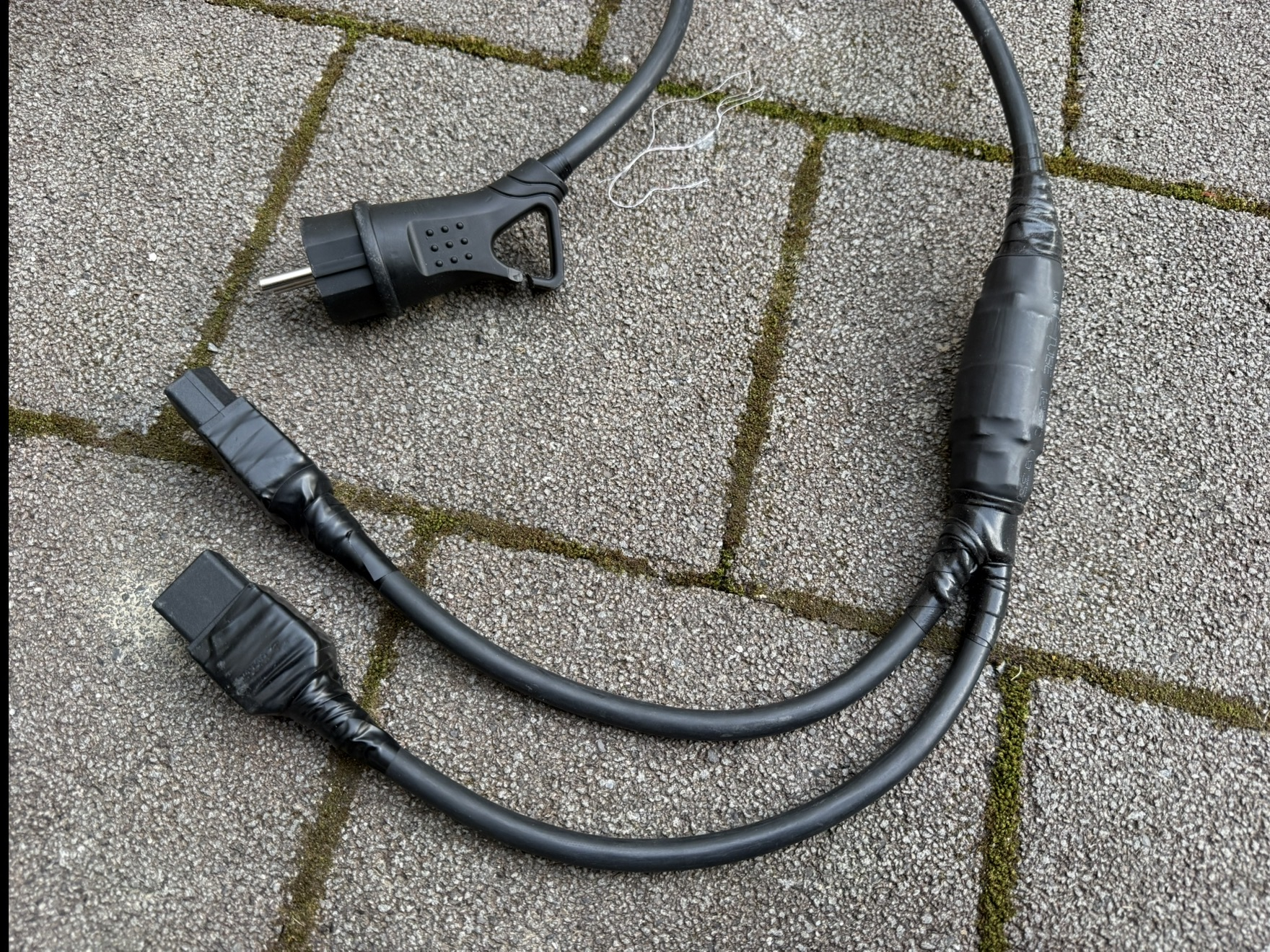 Hier noch das Y-Kabel um die Details zu zeigen. Der Plan war, maximal flexibel zu bleiben. Ich kann jetzt entweder ganz normal an jeder Schuko-Dose laden oder eben mit dem Adapter an Typ 2.